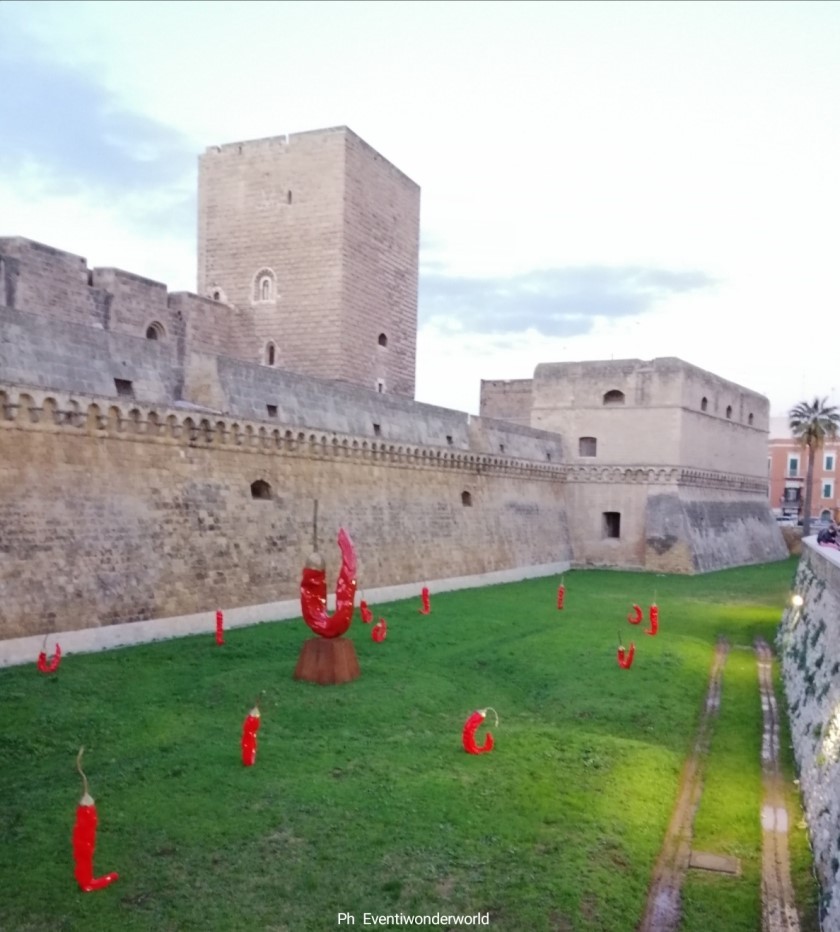 “E’ stata una domenica dal sapore primaverile qui nella nostra città di Bari. Accompagnati da un clima mite ed un forte profumo di iodio tipico del nostro centro città lambito dal profumatissimo Mar Adriatico, abbiamo visitato il magnifico Castello Svevo, la fortezza del capoluogo Pugliese risalente al XIII secolo, diventata poi prigione e adesso polo museale della Puglia. Già all’esterno siamo stati piacevolmente colpiti, essendo il fossato del castello pieno di simpatiche sculture colorate, opera dell’artista a tutto tondo Giuseppe Carta. I suoi peperoncini giganti, danno colore ed emozione e fanno presagire ciò che di fantastico può esserci all’interno delle sale del castello.