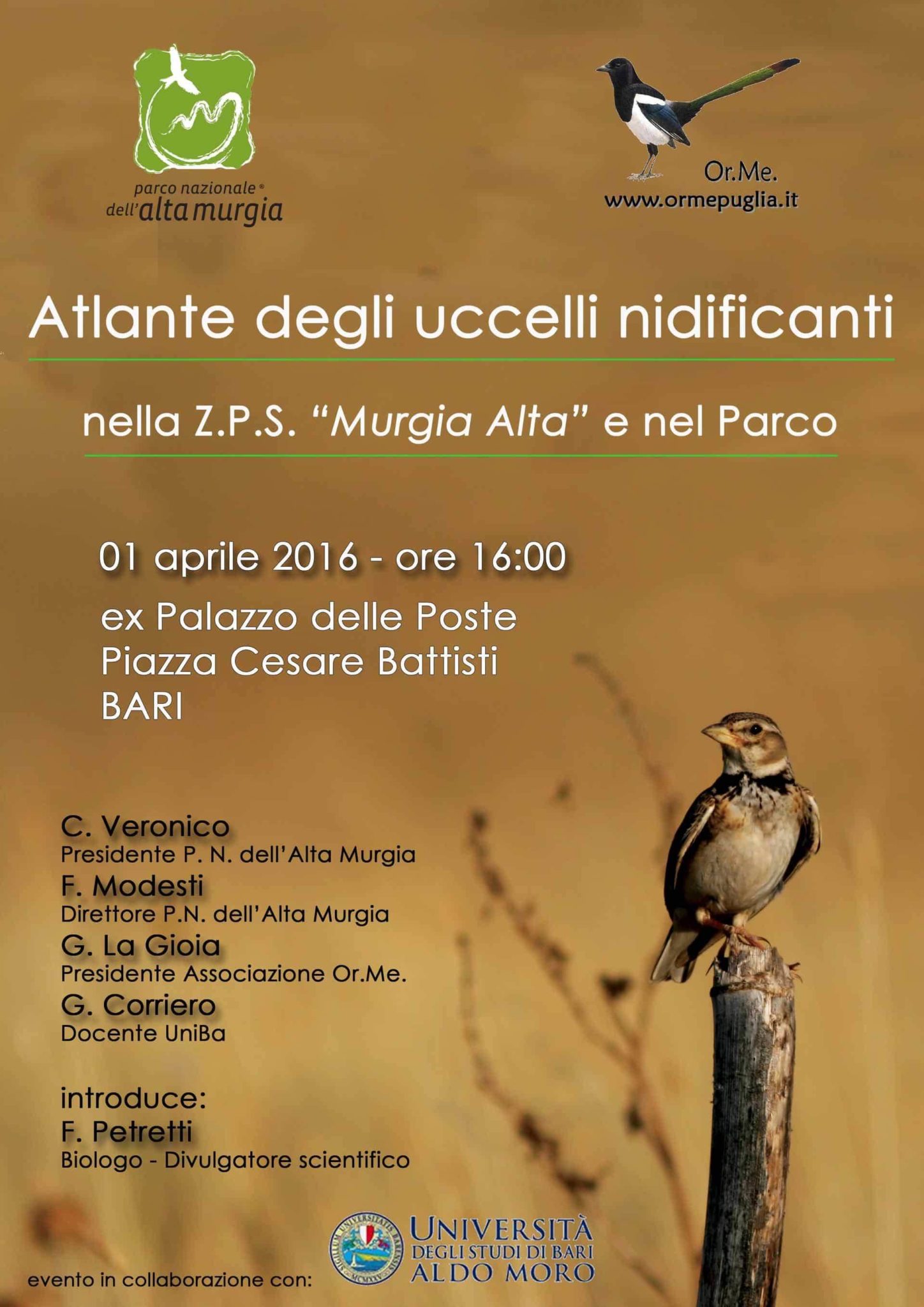 A dodici anni dalla sua istituzione, il Parco Nazionale dell’Alta Murgia presenta un volume che descrive tutte le specie di uccelli rilevate nell’area protetta, quale contributo alla conoscenza della sua biodiversità.rnrnVenerdì 1 Aprile 2016, alle ore 16,00 (e non come precedentemente comunicato alle 18,00) presso l’ex Palazzo delle Poste in Piazza Cesare Battisti, a Bari, sarà presentato il primo Atlante degli uccelli nidificanti della ZPS Murgia Alta e nel Parco in un evento realizzato in collaborazione con l’Università degli Studi Aldo Moro di Bari. rnrnAlla manifestazione parteciperanno il Presidente del Parco Nazionale dell’Alta Murgia, Cesare Veronico, il direttore dell’Ente Fabio Modesti, il Presidente dell’associazione Or.Me. Giuseppe La Gioia.rnrnL’introduzione dell’incontro sarà affidata a Francesco Petretti, biologo e divulgatore scientifico.rnrnIl libro rappresenta una delle iniziative più importanti sostenute dall’ Ente Parco Nazionale dell’Alta Murgia al fine di far crescere la conoscenza del patrimonio naturale di un territorio che va ben oltre i confini dell’Area Protetta. Inserita all’interno dei numerosi progetti di conservazione della Biodiversità, quest’opera, realizzata dall’associazione ORME e frutto di un impegno collettivo di numerose associazioni operanti sul territorio, testimonia la qualità delle professionalità coinvolte.rnrnLe informazioni raccolte in questo Atlante hanno molteplici utilità: possono essere impiegate per le attività di tutela della biodiversità e possono servire per iniziative collaterali da sviluppare nell’ambito dello scambio di ricercatori con altre aree protette, dell’offerta turistica per il birdwatching nel Parco, di iniziative divulgative.rnrnIl progetto ha comportato un’intensa attività di monitoraggio ornitologico da parte di Or.Me. (associazione per l’ornitologia e la gestione ambientale) secondo metodi standardizzati (soprattutto: transetti, punti d’ascolto, playback per rapaci notturni), che hanno permesso di raccogliere oltre l’80% dei dati utilizzati per la realizzazione delle mappe di distribuzione, pari complessivamente a 2487 dati grezzi in un anno.rnrnL’Atlante dedicato agli Uccelli nell’area protetta è un ulteriore e specifico contributo che il Parco dà alla conoscenza dell’immenso patrimonio naturalistico di un’area che custodisce un importante scrigno di biodiversità per la Regione Puglia e per tutta l’area mediterranea.rnrn