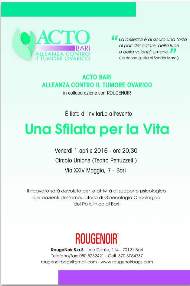 Il 1 aprile alle 20:30 la moda incontra la solidarietà nella serata organizzata da Acto Bari – Alleanza contro il Tumore Ovarico, che lancia così una raccolta fondi da devolvere al servizio di supporto psicologico per le pazienti dell’ambulatorio di Ginecologia Oncologica del Policlinico di Bari.rnrnGli abiti del negozio Rougenoir (Via Dante, 114 – www.rougenoirbags.com) coloreranno la Sala del Circolo Unione – Teatro Petruzzelli (Via XXIV maggio 7), indossati da modelle professioniste e non. A sfilare saranno infatti anche ex-pazienti o familiari di pazienti di tumore dell’ovaio o del seno.rnrnOltre a Rougenoir, contribuiranno alla serata a titolo gratuito anche gli esperti di hair and makeup, rispettivamente Mimì Colonna e Essence SPA, il fotografo Roberto Laruccia e Gianmarco Colayemma per luci e suoni, tutti professionisti che presteranno la loro opera gratuitamente per testimoniare il proprio sostegno ad Acto Bari.rnrn“Ringrazio fin da ora chi ci ha sostenuto nell’organizzazione e chi interverrà offrendoci il suo supporto” – afferma Adele Leone, presidente della Associazione barese – “solo unendo le forze riusciremo a attivare un servizio essenziale per le pazienti colpite da questo temibile tumore.”rnrnAl termine della sfilata, un cocktail attenderà tutti i partecipanti.rnrn rnrnPer ulteriori informazioni:rnrnACTO BARI – Adele Leone, cell. 335 6326968 – actoonlus.ba@gmail.com