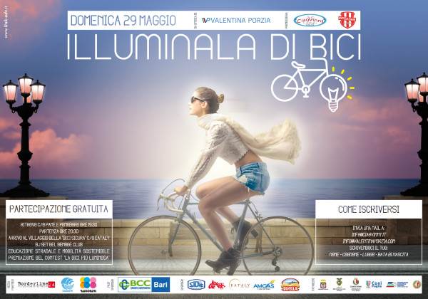 SAVE THE DATE!!!!!rnrnQUANDO? 29 Maggio 2016rnrnDOVE? Lungomare di BarirnrnCOSA?rn“Illuminala di Bici” nasce da un’idea di Valentina Porzia ed è promosso in collaborazione con la “ Fondazione Ciao Vinny” e A.s.d. Intesa Calcio.rn“Illuminala di Bici”, alla sua prima edizione, è una passeggiata in bici di 9km, che attraverserà il Lungomare di Bari. Partenza: Pane e Pomodoro Arrivo: Eataly – c/o Villaggio “Bici Sicura”rnLa manifestazione prende il suo nome dall’idea che ogni partecipante dovrà impegnarsi a rendere luminosa la sua bici.rn”Illuminala di Bici” è una serata di sport per promuovere e celebrare l’invenzione più importante dopo la ruota: le due ruote.rnLo scopo della manifestazione è quello di confermare i benefici delle due ruote, sensibilizzare la gente all’utilizzo della bici e, soprattutto, all’utilizzo di dispositivi luminosi e abbigliamento adeguato.rnLa manifestazione si propone, infatti, di unire la PRATICA SPORTIVA al tema della SICUREZZA STRADALE.rnrnIL PROGRAMMA?rn• Ore 19.30 apertura del Villaggio della Bici c/o Pane e Pomodororn• Ore 20.30: partenza delle Bici da Pane e Pomodoro e passeggiata fino al “VILLAGGIO DELLA BICI SICURA” c/o parcheggio di Eataly.rn• Ore 21.15: inizio festa al “VILLAGGIO DELLA BICI SICURA” con Musica live del Demodè club e attività ludiche legate al mondo delle due ruote e della sicurezza stradale .rnrnIL CONTEST?rnNel corso della serata, le bici dovranno essere illuminate con gli standard dispositivi luminosi e con qualunque altro strumento di illuminazione. Le stesse bici potranno partecipare al Contest “LA BICI PIU’ LUMINOSA” che premierà il mezzo illuminato in modo più originalernrnCOME PARTECIPARE?rnL’evento è aperto proprio a tutti: grandi e bambini, famiglie e single.rnPARTECIPAZIONE GRATUITArnPer iscrizioni, INVIARE MAIL a: info@ciaovinny.it e info@valentinaporzia.comrnLa mail dovrà contenere: NOME, COGNOME E DATA DI NASCITA.rnrnPASSEGGIANO CON NOI: A.C.I.; Amichi di Michele Visaggi, Angeli ribelli, Velostazione, Veloservice, Mimmo Bucci, Elaborazioni, Federciclismo PugliarnrnVi aspettiamo!rn#illuminaladibicirn#bari