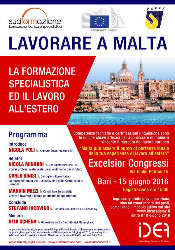 rnrnLa mattina dopo, il 16 giugno, i candidati interessati, in possesso delle qualifiche richieste e di una buona conoscenza della lingua inglese, potranno sostenere un colloquio di orientamento e pre-selezione per le offerte di lavoro disponibili nel mercato del lavoro maltese presso la sede di Sudformazione.rnrnI settori nei quali ci saranno le opportunità più interessanti sono quelli della Ristorazione: cuochi, pizzaioli, addetti bar, camerieri, ecc., il settore Finanziario: Account, senior e junior, e quello Informatico. Sarà possibile, inoltre, consultare offerte nel settore Tecnico: Operatori Cad, Designer, Architetti e così via, a seconda delle richieste delle aziende coinvolte. L’ingresso è gratuito previa iscrizione on line sul sito di Ideacademy.rnrnChi volesse anticipare il proprio CV = in italiano ed in inglese = può invece inviarlo a eures@regione.puglia.it con l’indicazione “Incontro Eures Malta”Lavorare a Malta, il 15 giugno incontro con Marvin Mizzi, consigliere Eures Malta