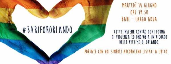 Domani, martedì 14 giugno, dalle ore 19.30, in largo Adua, cittadini e associazioni della città di Bari sono invitati a partecipare al sit – in di solidarietà organizzato in ricordo delle vittime di Orlando per manifestare ancora una volta la nostra opposizione ad ogni forma di intolleranza e omofobia.rnE’ importante esserci ed essere in tanti per confermare ancora una volta che Bari rifiuta qualsiasi forma di violenza e persegue politiche di integrazione e sviluppo per i diritti delle persone LGBTQI.rnrnHanno aderito:rnrn- Tavolo LGBTQI del Comune di Barirn- Cat Surf Barirn- Associazone Zona Frankarn- UDS Barirn- Rete della conoscenza Barirn- Cgil Barirn- Giovani Democratici Barirn- Link Barirn- Studenti Liberi Barirn- Partito Democratico Barirn- Attivisti PES Barirn- Arcilesbica Mediterranea BarirnrnPer info e adesioni è sufficiente inviare un messaggio alla pagina Facebook dell’evento https://www.facebook.com/events/254991231535644/