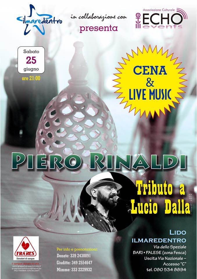 Musicista di formazione jazz, Lucio Dalla è stato uno dei più importanti e innovativi cantautori italiani. Sempre alla ricerca costante di nuovi stimoli e orizzonti, si è addentrato con curiosità ed eclettismo nei più svariati generi musicali, dando alla luce brani che sono entrati a pieno titolo nella storia della musica della nostra nazione.rnSabato 25 giugno al lido Ilmaredentro in zona Fesca, a Bari, in partnership con l’associazione culturale Echo Events diretta da Donato Sasso, sarà proposto un tributo a Lucio Dalla con la performance del cantante Piero Rinaldi, accompagnato dalla sua band.rnrnIntraprendente autodidatta, Rinaldi si è avvicinato alla musica e al canto a sedici anni con il suo primo gruppo “I Ragazzi del cielo”, con cui ha partecipato a diverse manifestazioni locali e alla trasmissione televisiva “E Catapuffa”. Numerose sono state le collaborazioni con gruppi musicali. Tra questi è stata la voce dei “Midnight Sound”, con Luciano Picciotti alla batteria, Vito Piacentini alla chitarra, Paolo Solimine al basso sostituito, poi, da Franco Quinio e Rocco Corcelli, alle tastiere. Nel 2012 Piero Rinaldi ha creato una propria tribute band dedicata al noto Lucio Dalla, a seguita della sua prematura scomparsa. Il progetto, il cui nome era “Dallando”, ha riscosso numerosi consensi nei locali di Bari e provincia e nelle piazze locali avvalendosi della collaborazione, alternativamente, di alcuni dei migliori musicisti del territorio quali Mino Petruzzelli, Michele Acquafredda e Felice Di Turi alla batteria, Pino Parisi, Gianluca Aceto e Pierpaolo Giandomenico al basso, Pino Mazzarano alle chitarre e Rocco Corcelli e AntonioVinci alle tastiere. Durante gli spettacoli proposti, Rinaldi ha fatto spesso intervenire come “special guest” la cantante Iskra Menarini tra le vocalist con le quali Lucio Dalla ha collaborato di più. Dopo una breve interruzione con la quale Rinaldi si è dedicato al cantautorato italiano a trecentosessanta gradi, ha ripreso il progetto tributo con una nuova veste e un nuovo spettacolo, chiamandolo semplicemente “Ciao”. In questa seconda fase oltre ad avere l’approvazione e il supporto della cantante di Dalla, ha avuto l’appoggio del chitarrista Ricky Portera, che ha spesso dato il suo contributo durante gli spettacoli, anch’esso come “special guest”.rnrnDurante la performance al lido Ilmaredentro Piero Rinaldi, accompagnato dalla sua band, proporrà alcuni dei brani più apprezzati della discografia del grande Lucio Dalla.rnrnIlmaredentro – Via dello Speziale – BarirnInfoline: 0805348894 – 3392438891rnApertura: 21:30