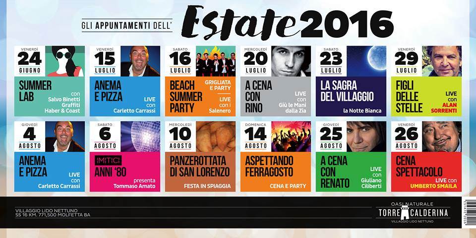rnrnTutti gli appuntamentirnrnE se ci fosse un’oasi a voi vicina dove si respira appieno aria di vacanza, serenità, natura, in una sola parola ESTATE? In cui un tramonto già racconta della bellezza dei luoghi? Quel posto dell’anima esiste e si chiama Oasi naturale Torre Calderina. Quest’estate è scesa in campo in grande spolvero con un programma di appuntamenti che racconta della sua dimensione sostenibile, a misura di ciascuno e nel totale rispetto della natura, tra tributi a grandi cantautori con le migliori band del territorio e spettacoli dal vivo, passando per la cultura con la rassegna letterariarnrn“Spiagge d’autore”, dal 23 luglio al 30 di agosto, alla cena spettacolo “Anema e Pizza” in compagnia del coinvolgente Carletto Carrassi sino ai due concerti di punta: i live di Alan Sorrenti e Umberto Smaila. Imperdibile la “Notte bianca” firmata Oasi naturale Torre Calderina in programma sabato 23 luglio che catalizza l’attenzione di tantissime persone ansiose di godere appieno tutta la notte. Continuano a costellare il nutrito calendario gli omaggi a due grandi della musica: Rino Gaetano con cena e live della band “Giù le mani dalla zia” il 20 luglio e lo spettacolo per tutti i sorcini, il live di Giuliano Ciliberti “A cena con Renato”, interamente dedicato a Renato Zero, giovedì 25 agosto.rnrnSpazio anche agli amanti della decade indimenticabile degli anni ’80, con il format di grande successo MITICI sabato 6 agosto. E poi ancora party imperdibili che cadenzano il mese più caldo, agosto, come la notte di San Lorenzo e la festa in riva al mare a rimirar le stelle il 10 agosto, e “Aspettando Ferragosto”, il 14 agosto, con cena e party sino all’alba.rnrnVenerdì 29 luglio aspetteremo sognanti, noi, “figli delle stelle”, cullati dalla melodia e dalla dolcezza di uno dei più conosciuti e popolari artisti italiani, Alan Sorrenti, che si esibirà in uno splendido live, ripercorrendo la sua straordinaria carriera. E poi ancora un grande one man show, l’Umbertone nazionale, Umberto Smaila, con la sua capacità di coinvolgere tutti con i grandi successi della musica italiana, atteso per venerdì 26 agosto.rnrnLe suggestioni della natura e della luce dei tramonti indimenticabili di quel lembo di spiaggia adagiato tra Molfetta e Bisceglie, all’ombra di Torre Calderina, simbolo dei luoghi, incontrano seduzioni e vibrazioni di musica, letteratura, spettacolo e cibo di qualità. La vostra estate è già qui!