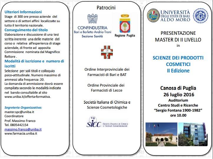 rnrnL’Università e il mondo del lavoro insieme per formare i cosmetologi del futuro: questo è l’obiettivo del Master universitario di II livello in Scienze dei Prodotti cosmetici, giunto alla sua seconda edizione.rnrnIl Master che è già alla II edizione è organizzato dal Dipartimento di Farmacia – Scienze del Farmaco dell’Università degli Studi di Bari e da Farmalabor.rnrnAll’inaugurazione che si terrà martedì 26 luglio alle ore 10,00 presso il Centro Studi e Ricerche “Sergio Fontana, 1900-1982”di Canosa di Puglia, interverranno il prof. Antonio Felice Uricchio (Rettore dell’Ateneo barese), il dott. Ernesto la Salvia (Sindaco di Canosa di Puglia), il prof. Roberto Perrone (Direttore Dip. Farmacia – Scienze del Farmaco, Uniba), il sen. dott. Luigi D’Ambrosio Lettieri (Presidente Ordine dei Farmacisti Bari/BAT) e il dott. Sergio Fontana (Presidente Sezione Sanità di Confindustria Bari e BAT). Farà da moderatore il prof. Massimo Franco, Coordinatore del Master.rnrnDopo i saluti istituzionali, seguirà la lezione introduttiva della dott.ssa Daniela Donelli (Responsabile del Dip. Formulazioni cosmetiche dell’azienda farmaceutica Angelini) dal titolo “Dall’idea allo scaffale”.rnrnL’intero percorso formativo è orientato alle reali dinamiche del mercato del lavoro: grande spazio sarà riservato alla fase in azienda, che si svilupperà in 300 ore (corrispondenti a 12 dei 60 CFU complessivi). Non si tratta di semplici stage ma di progetti realizzati in collaborazione con i professionisti Farmalabor, grazie ai quali i corsisti trasformeranno una solida base teorica in un know-how facilmente spendibile.rnrnIl Master punta a formare cosmetologi professionisti, figure professionali sempre più ricercate dalle aziende cosmetiche perché in grado di operare a diversi livelli: dall’ambito legislativo a quello tecnologico, dal marketing all’informazione tecnico-scientifica, passando per il controllo e la valutazione della sicurezza dei prodotti finiti.