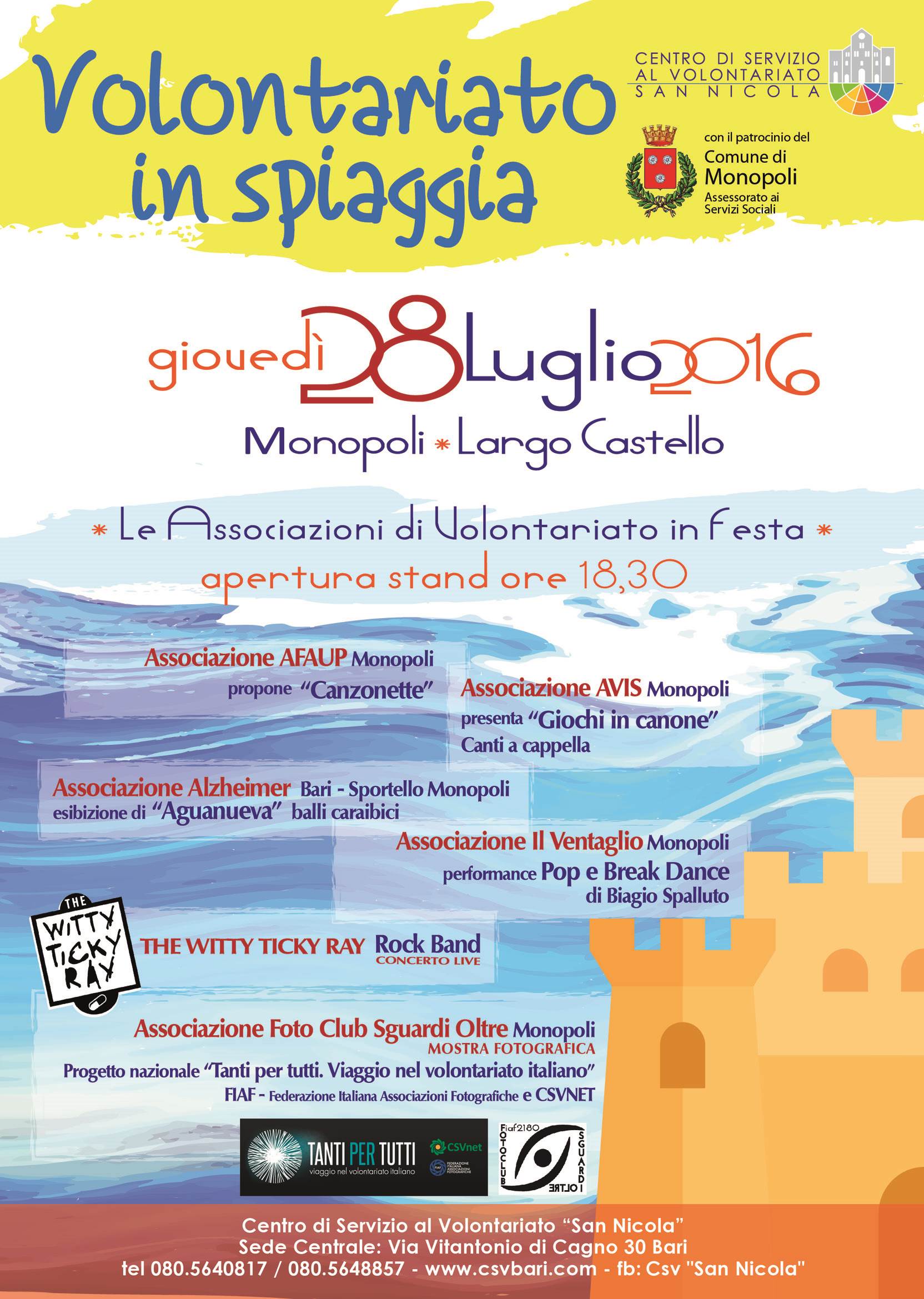 rnrnTorna VOLONTARIATO IN SPIAGGIA, tappa estiva del percorso di promozione pensato dal Centro di Servizio al Volontariato “San Nicola”, per consentire alle organizzazioni di volontariato del territorio, 22 in questa 8ᵃ edizione, di far conoscere a cittadini e turisti le loro attività, iniziative e progetti.rnrnLa manifestazione è realizzata in collaborazione con l’Assessorato ai Servizi sociali del Comune di Monopoli.8ᵃ ed. Volontariato in spiaggia in festa con le associazioni di volontariato