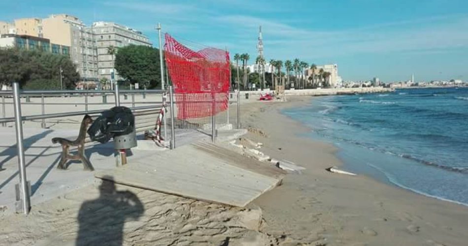 Donato Castellano (Scuola cani salvataggio nautico) ha denunciato sulla sua pagina facebook la chiusura della passerella per i disabili sulla spiaggia barese di Pane e Pomodoro. “Questa è la situazione ad oggi, sulla spiaggia di Pane e Pomodoro. Passerella dei disabili e conseguente accesso in acqua chiuso, come faranno i tanti amici diversamente abili che vengono in spiaggia questo week end ad entrare in mare per il bagno? Noi ci saremo con i nostri volontari, se la situazione persiste, credo sia difficile poterli aiutare, confidiamo in un miracolo! San Giuseppe Galasso e San Antonio Decaro fatelo questo miracolo”.rnrnIl Comune è intervenuto a tempo di record. Ed oggi lo stesso assessore ai Lavori pubblici si è recato sul posto. I lavori per la passerella per i disabili termineranno entro lunedì.