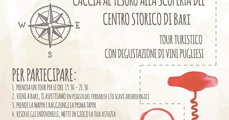 Dopo la pausa estiva torna venerdì 9 settembre “Bacco nelle corti”, il tour turistico alla scoperta della città vecchia con sosta per la degustazione di vini pugliesi. A guidare i turisti per la speciale caccia al tesoro organizzata per le strette vie di Bari Vecchia saranno i “guidattori”, teatranti in abiti d’epoca.