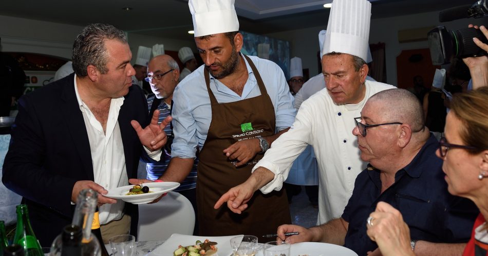 Francesco Spina e Giuseppe Lovascio vincono la quarta edizione di “Sindaci, ai fornelli!” tra l’entusiasmo del numeroso pubblico. Il loro piatto la giusta composizione tra mare e terra nel nome della Puglia. Con i loro “laganari con spigola, crema di melanzane e mozzarella affumicata, capocollo di Martina Franca croccante e scorza di limone grattuggiata” hanno convinto le giurie. I due sindaci, rispettivamente di Bisceglie e di Conversano, che militavano in prima squadra, affiancati dai validissimi chef Andrea Cannalire, chef stellato Michelin, del ristorante “Cielo” di Ostuni(BR) e da Gianni Viceconte, dell’Accademia Italiana Gastronomia Storica, si sono contesi l’incoronazione con altre quattro squadre agguerrite. In seconda squadra il sindaco di Corato (BA) Massimo Mazzilli con lo chef Giovanni Lorusso del ristorante “Memory Resort” di Bisceglie (BT), e il sindaco di San Giovanni Rotondo (FG) Costanzo Cascavilla con lo chef Mario Musci del ristorante “Gallo” di Trani (BT). Per la terza squadra il sindaco di Bari Antonio Decaro con lo chef Angelo Di Biccari del ristorante “Pane e salute” di Orsara di Puglia (FG), e Raimondo Innamorato, sindaco di Noicattaro (BA) con Mino De Bari dell’Osteria di Chichibio a Polignano a mare. In quarta squadra Antonio Donatelli, sindaco di Triggiano (BA) con lo chef tutor Salvatore Riontino, ristorante “Canneto Beach 2” di Margherita di Savoia (BT), e Giuliana Falaschi, sindaco di Citerna (PG), con Ippazio Turco del ristorante “Lemì” di Tricase (LE). In quinta squadra Fiorenza Pascazio, sindaco di Bitetto (BA) con lo chef Domenico Capogrosso dell’Osteria Del Buono di Trani (BT), e il sindaco di Capurso (BA) Francesco Crudelecon lo chef Cosimo Russo del ristorante “Acqua” di Porto Cesareo (LE).