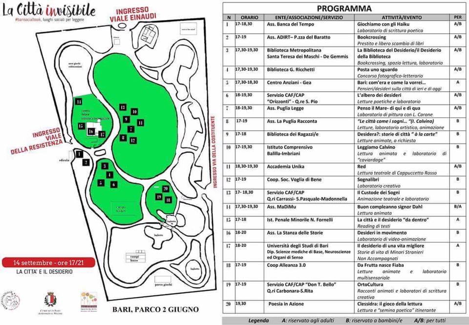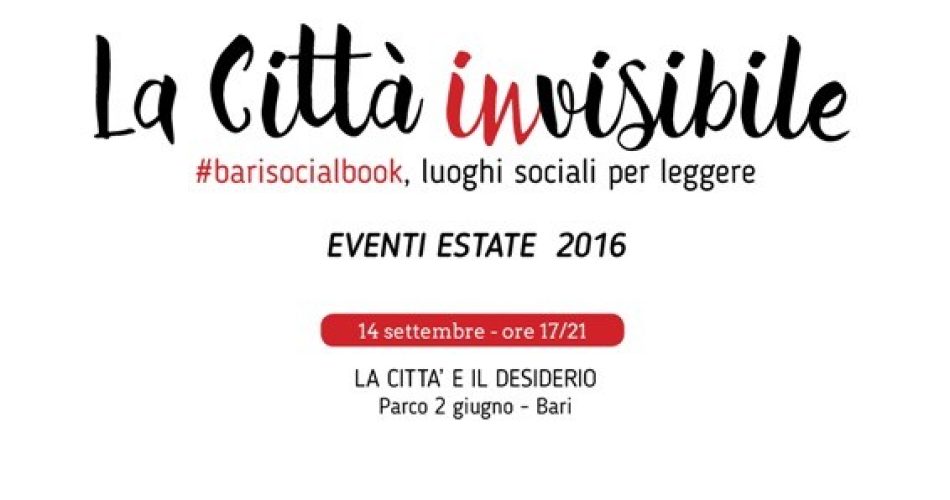 Nell’ambito della manifestazione di promozione alla lettura “La Città in-Visibile”, realizzata da #Barisocialbook – luoghi sociali per leggere, rete tra enti e istituzioni pubbliche e private, biblioteche, librerie, associazioni, enti non profit, strutture e servizi welfare per minori, adulti e migranti promossa dall’assessorato al Welfare del Comune di Bari e dall’ufficio del Garante dei Diritti dell’Infanzia e dell’Adolescenza del Consiglio Regionale Pugliese, domani, mercoledì 14 settembre, a partire dalle ore 17.00 fino alle 21.00, si svolgerà presso il parco di Largo 2 Giugno l’evento conclusivo dal titolo “La Città e il Desiderio”.
