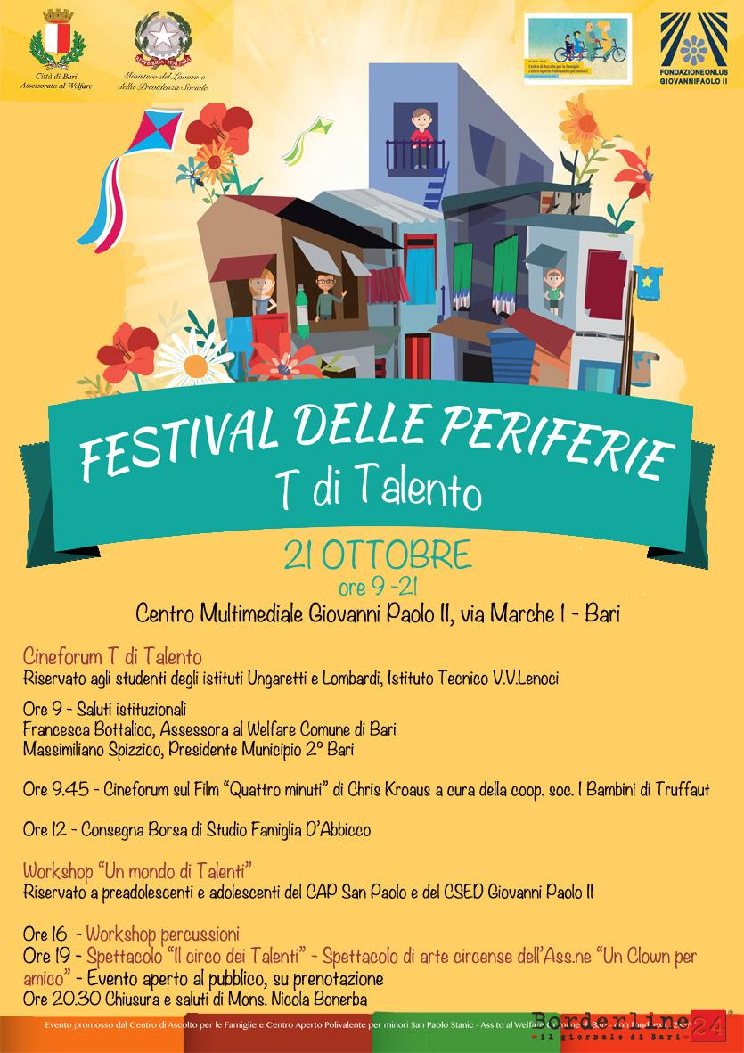 Si terrà domani, venerdì 21 ottobre, dalle ore 9 alle 21, l’edizione numero uno del “Festival delle periferie”, dedicata alla lettera “T di talenti”: un’iniziativa promossa dal Centro di ascolto per le famiglie e Centro aperto polivalente per minori San Paolo Stanic – servizio dell’assessorato comunale al Welfare finanziato con fondi ex L. 285/97.rnL’evento avrà luogo nel Centro multimediale Giovanni Paolo II, in via Marche 1, al quartiere San Paolo.rnIl festival nasce con l’obiettivo di promuovere una riflessione attiva e partecipata sul tema delle periferie, privilegiando un approccio positivo e di valorizzazione dei talenti che, se coltivati, nascono e si rafforzano anche in contesti sociali e urbani caratterizzati da difficoltà e disagio di tipo socio-economico.rnL’intento è quello di avviare una riflessione polifonica e multidisciplinare con uno sguardo che parte dalla periferia per proiettarsi verso il resto della città, sino a comporre e decostruire un alfabeto simbolico di sentimenti, pratiche, progetti e storie di vita.rnPer l’edizione del 2016 il tema scelto è quello dei talenti, per esplorare la capacità di persone e luoghi di perseguire e praticare azioni quotidiane di liberazione.rnLa manifestazione prenderà il via alle ore 9 con i saluti di Francesca Bottalico, assessora al Welfare del Comune di Bari, Massimiliano Spizzico, presidente del Municipio e mons. Nicola Bonerba, presidente della Fondazione Giovanni Paolo II onlus.rnLa riflessione sui temi dell’evento sarà avviata con la proiezione del film “Quattro minuti” di Chris Kroaus, in collaborazione con la cooperativa sociale “I bambini di Truffaut”.rnAlle ore 12 saranno consegnate le borse di studio donate dalla famiglia D’Abbicco a un minore del Centro aperto polivalente e a un minore del Centro socio-educativo Giovanni Paolo II.rnI lavori riprenderanno nel pomeriggio, alle ore 16, con una sessione di workshop di percussioni a cura di esperti di laboratorio brasiliani e nigeriani rivolto ai giovani che frequentano i due centri.rnAlle ore 19 si terrà “Il circo dei Talenti”, spettacolo di arte circense a cura dell’associazione “Un Clown per amico”: l’evento è aperto al pubblico ma occorre prenotare rivolgendosi al Centro famiglie San Paolo Stanic – tel. 080 9758757 – caf@fgp2.it.rnAlle 20.30 circa le conclusioni e i saluti saranno affidati al presidente della Fondazione Giovanni Paolo II onlus.