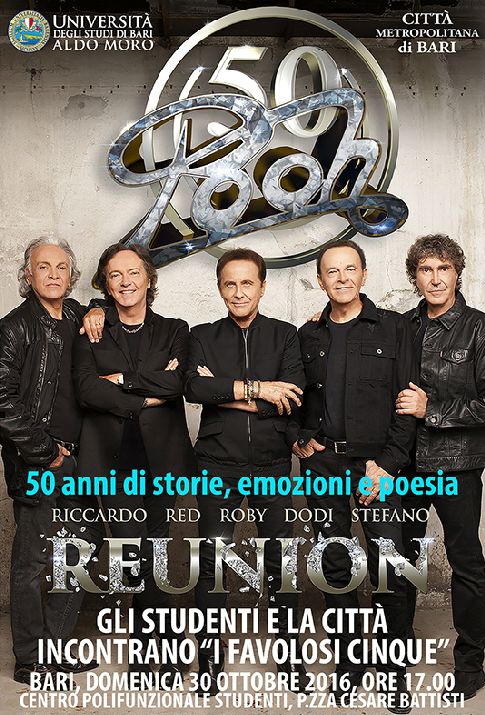 Un trofeo da incorniciare: 50 anni di carriera sui palchi di tutta Italia. Per celebrare il risultato insieme ai propri fan i Pooh hanno organizzato un tour in diverse città. Tra queste c’è anche Bari, dove Roby Facchinetti, Dodi Battaglia, Red Canzian, Stefano D’Orazio, Riccardo Fogli otterranno anche un riconoscimento.rnrnDomenica 30 ottobre alle 17 i componenti della band verranno premiati dalla Città metropolitana all’ex Palazzo delle poste in piazza Cesare Battisti “a testimonianza – spiegano dall’amministrazione – del forte legame del gruppo con la gente e la terra metropolitana di Bari manifestato in molteplici occasioni”. I fan di Roby Facchinetti & co potranno quindi incontrare i loro beniamini della musica, che ripercorreranno durante l’incontro anche i tanti successi ottenuti in 50 anni di carriera.rnrnAll’iniziativa, promossa dall’Università degli Studi di Bari e intitolata “I favolosi cinque: 50 anni di storie, emozioni e poesia”, parteciperanno anche il presidente della Regione Puglia Michele Emiliano, il sindaco di Bari Antonio Decaro, il sindaco di Bitonto Michele Abbaticchio e il rettore dell’Università di Bari Antonio Felice Uricchio.