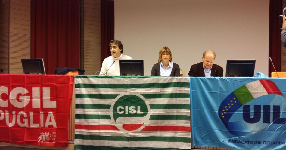 La stroncatura è netta, i sindacati Cgil, Cisl e Uil bocciano a tutto campo l’azione del governo regionale sulla sanità parlando di un “settore allo sfascio”. Lo fanno convocando una conferenza stampa ad hoc e annunciando l’inizio della mobilitazione di tutto il comparto sanitario pugliese.rnrnDa un piano di riordino “carente” alle “inaccettabili liste di attesa”, passando per un organico che conta “5mila dipendenti in meno” tra medici e infermieri, sino ad una “necessaria ridistribuzione dei posti letto tra le province”: sono solamente alcuni dei punti critici individuati stamattina dai segretari confederali di Cgil, Cisl, Uil, Giuseppe Gesmundo, Daniela Fumarola e Aldo Pugliese. I sindacalisti lamentano anche il loro mancato coinvolgimento nello stilare il piano di riordino ospedaliero: “I nostri suggerimenti messi nero su bianco sono stati ignorati”. “Il governatore Emiliano ed il dottor Gorgoni – spiegano i tre segretari – ci dissero che il nostro lavoro era a tal punto condivisibile che avrebbero potuto sottoscrivere il nostro documento. Se lo avessero fatto non avrebbero ricevuto le osservazioni del ministero che ha evidenziato quanto il piano presentato dalla Regione Puglia fosse carente nella riorganizzazione territoriale di emergenza-urgenza, carente nella organizzazione delle reti ed in particolare quelle delle malattie tempo dipendenti (patologie cardiovascolari, infarti) in ragione delle complessità assistenziali. Quando noi diciamo che manca la trama – hanno osservato Gesmundo, Fumarola e Pugliese – ci riferiamo al fatto che non esistono reti. Il ministero ha anche eccepito il mancato avvio della centrale unica degli acquisti che avrebbe portato ad una razionalizzazione delle risorse, cosi come la stessa razionalizzazione della spesa farmaceutica: con queste economie si sarebbe potuto investire, per esempio, nell’implementazione degli operatori sanitari data la carenza di personale pari ad almeno 5000 unità”.rnrnA questo, secondo i sindacalisti, “si aggiunge l’urgenza di ridistribuzione dei posti letto su base territoriale in ragione della lettura dei dati epidemiologici, senza dimenticare che la media posti letto ogni 1000 abitanti, in Puglia, è molto inferiore alla media nazionale (3,4 contro 3,7) nonostante le tante emergenze sanitarie in atto”. C’è poi l’annoso problema delle liste d’attesa che “costringe alla mobilità passiva”. “Continuiamo a dire – proseguono – che occorre la contestuale conversione degli ospedali da chiudere con l’istituzione dei presidi territoriali di assistenza (Pta) per rendere più appropriata l’offerta territoriale dei servizi”. “Per queste e per tante altre ragioni – concludono – abbiamo deciso di mobilitarci e mobilitare le coscienze: perché occuparsi di sanità e sociosanitario è questione di tutti i cittadini pugliesi che noi vogliamo tutelare e rappresentare al meglio