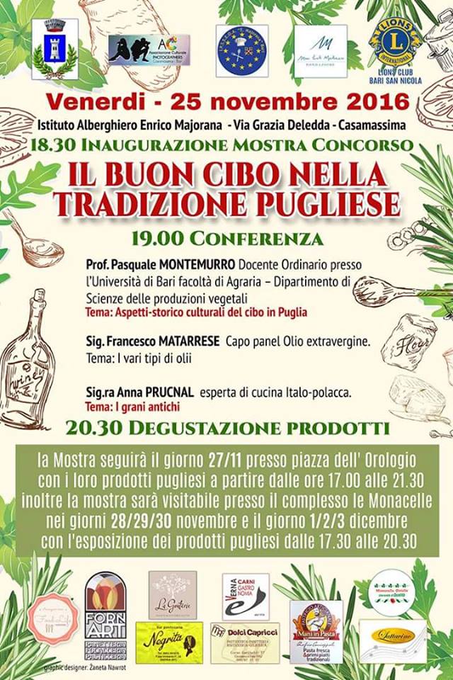 Proseguono le selezione del concorso “Il buon cibo nella tradizione pugliese” organizzato dall’A.C. Photographers e dalla Fondazione “Mons. Sante Montanaro”, con il patrocinio del Comune di Casamassima e con la partecipazione del Lions club Bari.rnrnL’autore dovrà inviare le sue opere in formato digitale all’indirizzo e-mail acphotographers@libero.it entro il 15 novembre 2016 con l’oggetto: Il buon cibo nella tradizione pugliese, indicando nome e cognome e titolo del piatto. La partecipazione al concorso è gratuita.rnrnL’autore potrà inviare un numero di opere a sua scelta, non superiore a 5. Unitamente alle foto dovrà consegnare compilato in ogni sua parte il modulo di iscrizione da richiedere all’associazione. Le opere verranno successivamente pubblicate su Facebook sulla pagina ‘FOOD life Casamassima’. Dal momento in cui verranno pubblicate sulla pagina, parte ufficialmente il concorso e sarà possibile votare fino al 20 novembre. Saranno valutate le interazioni (like, commenti e condivisioni).rnrnSeguirà la votazione finale da parte di una giuria tecnica composta da G. Mario de Matteo, Anna Prucnal e Luna Pastore. Saranno premiate le foto che rappresenteranno al meglio la tradizione pugliese sia tecnicamente che fotogenicamente.rnrnLe migliori foto saranno stampate per crearne una mostra allestita il prossimo 25 novembre nel foyer dell’Istituto “E. Majorana” di Casamassima in occasione di una conferenza che promuoverà i prodotti più genuini e le ricette migliori della nostra cucina, associando gusto e benessere. L’esposizione sarà poi spostata il 27 novembre in Piazza del Popolo, nel cuore del centro storico casamassimese, e dal 28 novembre al 3 dicembre nelle sale al piano terra di palazzo Monacelle.