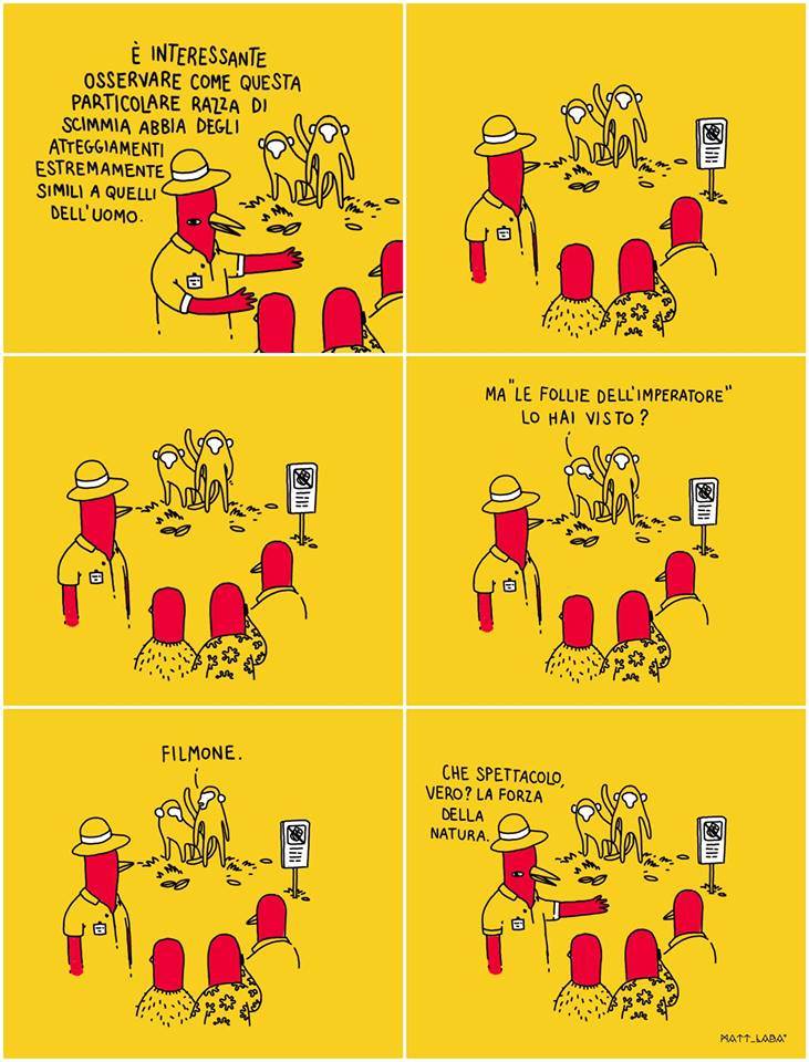 Vedo l’Uomo uccello come un mio alterego, quindi cerco di sempre di essere onesto e sincero quando faccio una vignetta e di fargli dire quello che direi io. Quando scrivo lascio che sia un flusso di pensieri ad andare dalla mia testa fino al foglio, come se parlassi con un amico. Quindi sì, c’è molto di me e della mia vita. La vignetta che cita ‘Le follie dell’Imperatore’ ad esempio, è una situazione che ho vissuto al bar mentre parlavo coi miei amici dell’università: io sono il classico personaggio – che c’è in tutte le comitive – che non riesce essere concentrato su qualcosa per più di tre minuti e che finisce sempre a parlare d’altro.