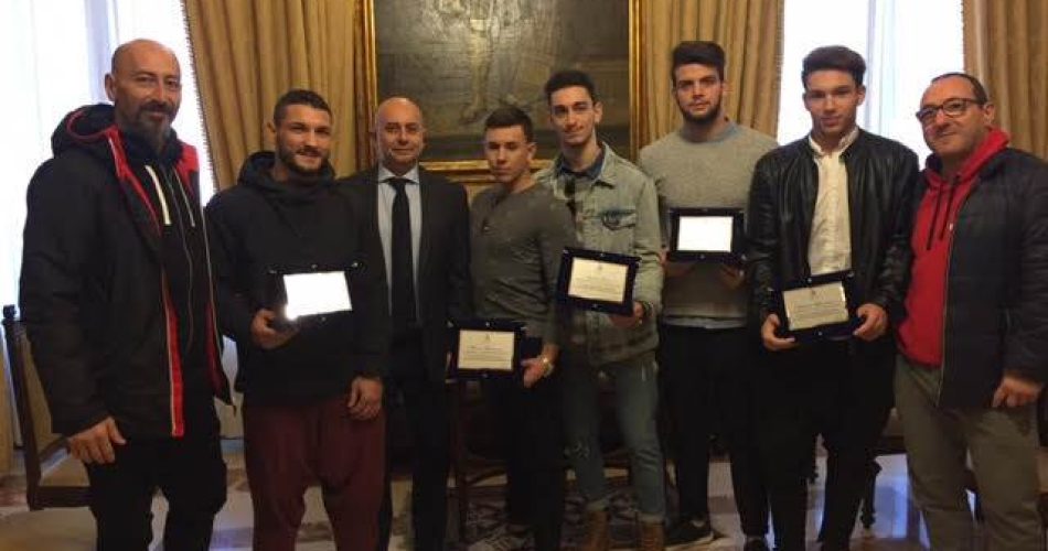 Un riconoscimento per i risultati raggiunti in competizioni sportive in Italia e all’estero. È stato il vicesindaco Brandi a premiare cinque atleti di mma, un’arte marziale, a Palazzo di città questa mattina. Le mixed martial arts compongono una disciplina che comprende diversi stili di combattimento con pugni e calci, proiezioni, leve e strangolamenti.rnrnI premiatirnrnI premiati sono tutti allievi dell’associazione sportiva Sankaku: Luca Landi – campione Italiano mma 2016 nella categoria Seniores -, Alessandro Rizzi – campione Italiano mma 2016 nella categoria Juniores -, Giovanni Bozzi – terzo classificato nel campionato italiano mma 2016 categoria Juniores -, Giovanni Fusano – terzo classificato nel campionato Italiano mma 2016 in categoria Juniores – e il judoka Luigi Bartoli, terzo classificato nel trofeo internazionale “Nelson Mandela” in categoria Seniores.rnrnLa cerimoniarnrnAll’evento hanno partecipato anche Mario Landi, presidente dell’Asd Sankaku e il maestro Dino Bartoli. Entrambi hanno sottolineato l’importanza per i ragazzi del riconoscimento ottenuto dal Comune per le loro vittorie, arrivate dopo sacrifici e sconfitte, da cui però hanno saputo imparare.rnrn”Vi porto – ha dichiarato il vicesindaco Brandi durante la cerimonia – il saluto del sindaco Decaro e dell’assessore allo Sport Pietro Petruzzelli, che non sono qui per impegni istituzionali. Questa targa è il riconoscimento della città, che è fiera di voi e dei vostri successi. Bari vi ringrazia. Chiederò al presidente di citare i vostri nomi in apertura del prossimo Consiglio Comunale”.