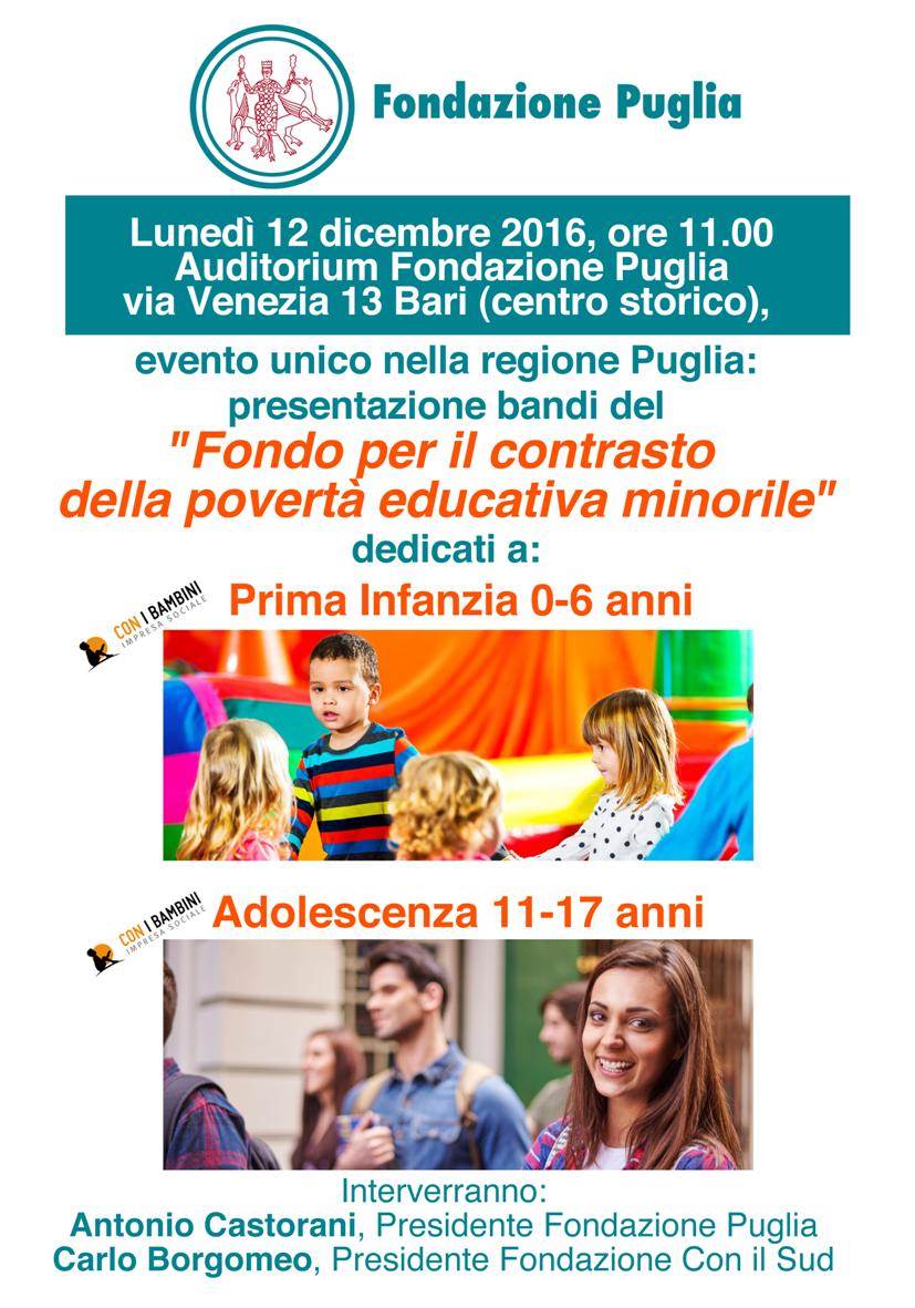 La Fondazione Puglia chiama a raccolta il mondo della scuola e le associazioni del terzo settore: lunedì, 12 dicembre, alle 11, nell’Auditorium della sede della Fondazione Puglia (via Venezia 13 a Bari), il presidente Antonio Castorani e il presidente della Fondazione Con il Sud, Carlo Borgomeo, illustreranno i due bandi e le modallità di partecipazione.