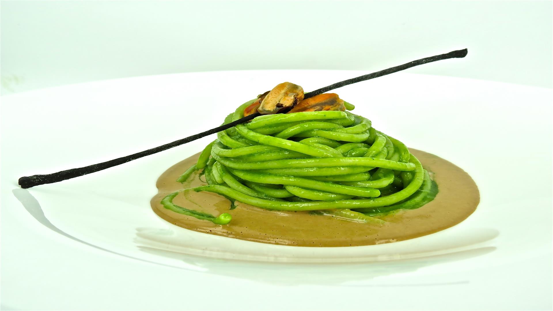 Spaghettone Gerardo di Nola con crema di cozze e clorofilla di prezzemolo