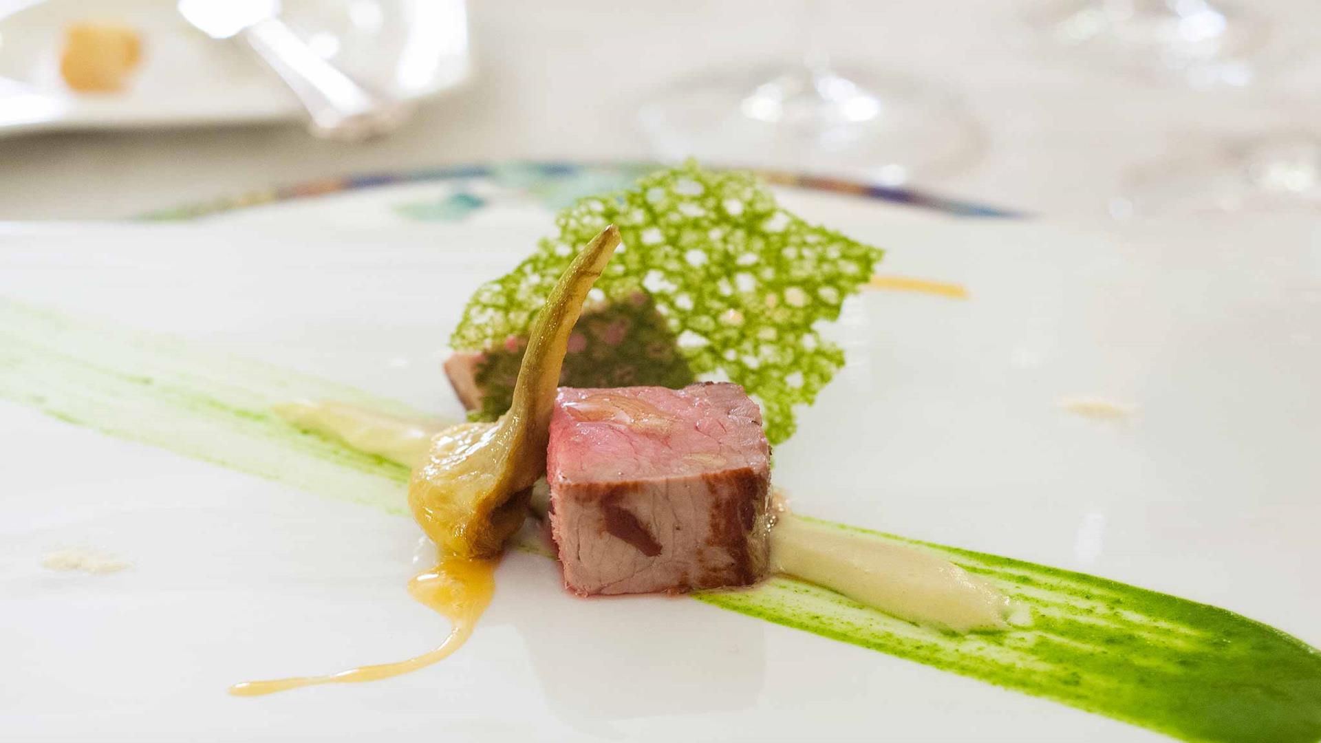 Scamone di sanato Piemontese con carciofi e riduzione di agrumi. Quella creazione merlettata è un chips di clorofilla, bello e buono.
