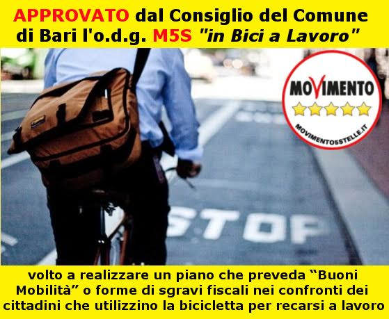 Il consiglio comunale ha approvato all’unanimità l’ordine del giorno del M5S “in Bici al Lavoro”. “La mobilità sostenibile – commentano i consiglieri Sabino Marco Mangano e Francesco Colella – è uno dei punti cardine del nostro programma e la proposta è nata dalla constatazione che ogni spostamento in bicicletta anziché in automobile genera economie e vantaggi considerevoli, tanto per l’individuo quanto per la collettività urbana: minore deterioramento della rete stradale e riduzione del programma di nuove infrastrutture stradali; maggiore attrattiva del centro città (negozi, cultura, ricreazione, vita sociale); riduce l’inquinamento, il traffico sulle strade e i costi sostenuti per gli spostamenti (benzina, ticket parcheggio)”.rnrn”Inoltre pedalare – proseguono i pentastellati – si traduce in grandi benefici per il sistema cardiovascolare, è molto meno faticoso e più veloce che camminare o attendere i mezzi pubblici e se si è stanchi di stare nel traffico è possibile scegliere un percorso alternativo che magari attraversa un parco o una zona pedonale”.rnrnIl sindaco e la Giunta tutta, in collaborazione con le altre forze politiche, si impegneranno alla realizzazione di un piano che preveda “Buoni Mobilità” o forme di sgravi fiscali nei confronti di quei cittadini che utilizzino la bicicletta per recarsi a lavoro.rnrn”Sono numerosi – spiegano – gli stati europei nei quali da tempo vengono applicate tali misure come Belgio, Paesi Bassi, Danimarca, Svizzera, Germania e in particolare in Francia è previsto per i dipendenti che si rechino a lavoro in bicicletta il rimborso, da parte dell’azienda, di 0,25 centesimi di euro per ogni km percorso. L’azienda rientrerà nei costi di tale operazione con detrazioni fiscali”.rnrn”Nei prossimi mesi parteciperemo attivamente – concludono – alla redazione delle linee guida e di un eventuale regolamento per rendere operativo il nostro ordine del giorno, continuando come sempre a spingere la mobilità sostenibile con richieste di nuove rastrelliere e piste ciclabili”.