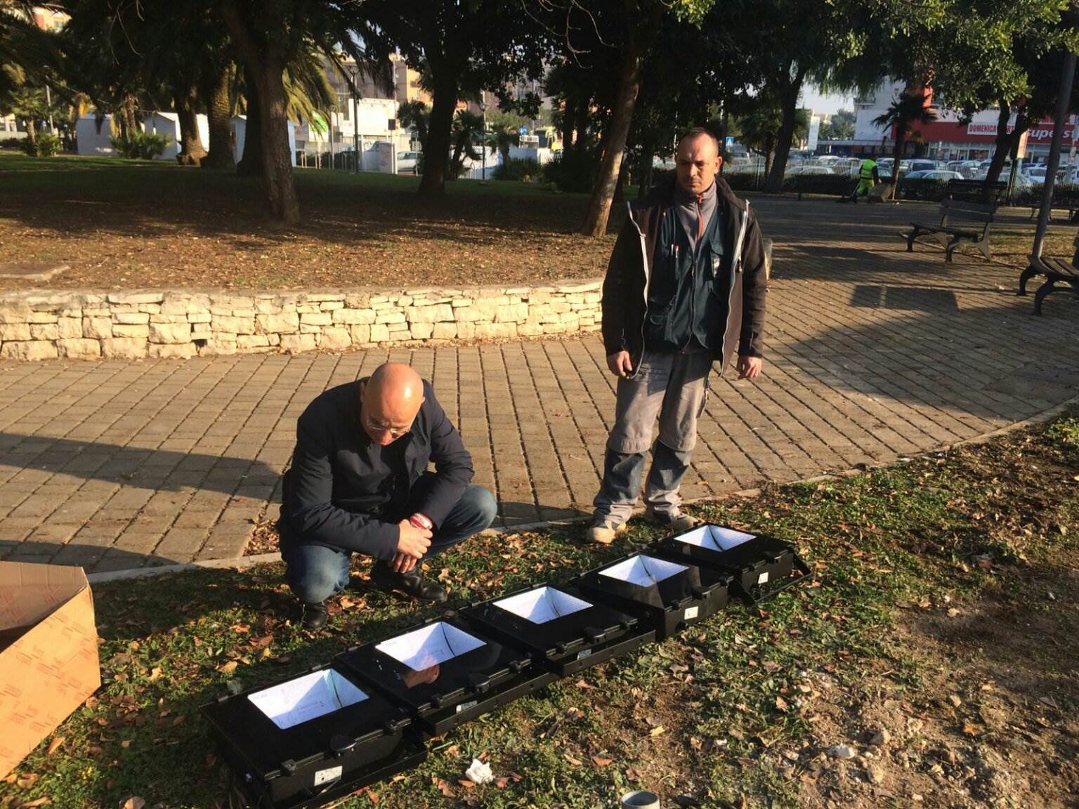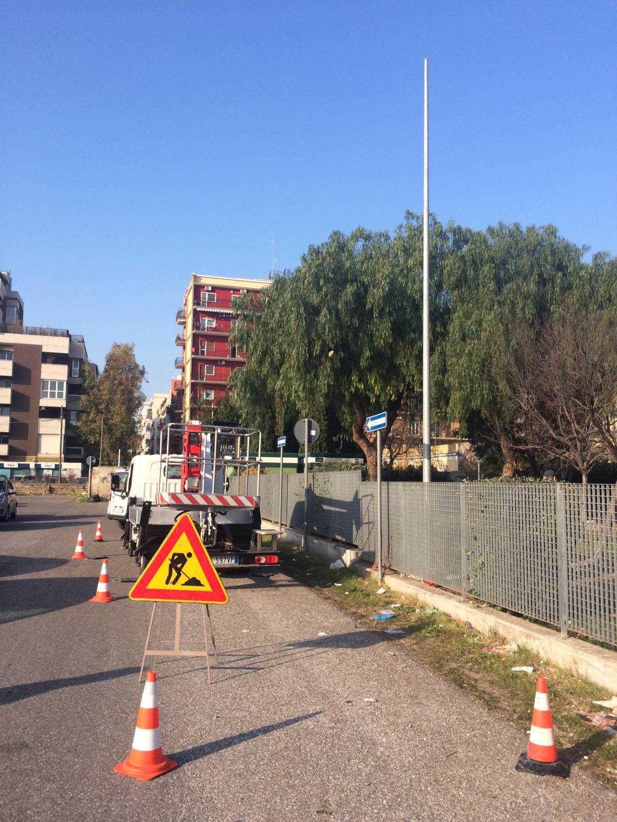 rnrnSono cominciati oggi i lavori per la sistemazione di un palo da dieci metri che reggerà cinque proiettori nel park and ride di largo Due Giugno. Serviranno ad illuminare oltre la metà dell’area di parcheggio per garantire maggiore sicurezza agli utenti.rnrnQuesto intervento rappresenta una prima soluzione efficace contro furti e atti di vandalismo alle auto in sosta, in attesa della pubblicazione del bando di gara per i lavori di riqualificazione dell’intera area del park&ride di largo 2 Giugno, prevista per i primi giorni del 2017.rnrn“Si tratta di un intervento a carattere temporaneo – spiega l’assessore ai Lavori pubblici, Giuseppe Galasso – con il quale intendiamo dare un segnale di attenzione agli utenti del park&ride, che nelle ultime settimane hanno lamentato atti vandalici e furti. In questo modo vogliamo dare una risposta immediata in attesa dei tempi necessari ad espletare la procedura che ci consentirà di trasformare quello spazio in un’area verde attrezzata per la sosta delle auto. Nel nuovo progetto, inoltre, è previsto un sistema di pubblica illuminazione con 40 pali, dotati di lampade a led, e un sistema di videosorveglianza in linea con il sistema standard attuale full hd e infrarossi per le riprese notturne”. Sono stati incrementati anche i controlli da parte della polizia municipale.rnrn