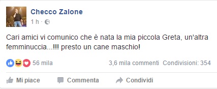 Fiocco rosa in casa Zalone. Con una battuta sulla sua pagina Facebook, l’attore, comico e cantautore barese dà il benvenuto alla piccola Greta, sua secondogenita.