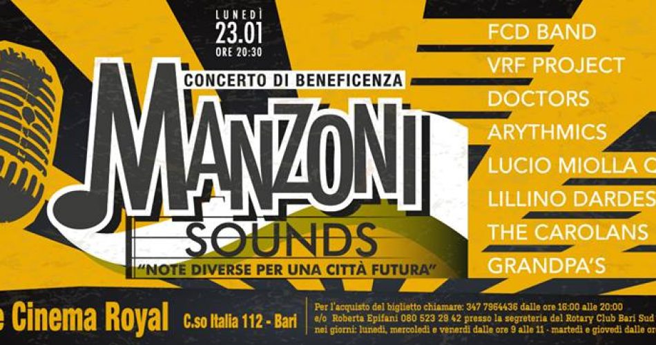 Otto bands di “dilettanti professionisti” (FDC BAND, VRF PROSECT, DOCTORS, ARYTHIMICS, LUCIO MIOLLA QUARTER, LILLINO DARDES, THE CAROLANS, GRANDPA’S) si alterneranno sul palco di AncheCinema Teatro Royal per “suonare la carica” al quartiere Libertà di Bari nel corso di un concerto di beneficenza dal titolo emblematico “MANZONI SOUNDS”, in “onore” della strada che un tempo era quella più commerciale per antonomasia e che oggi più di altre vive la pesante crisi del commercio.
