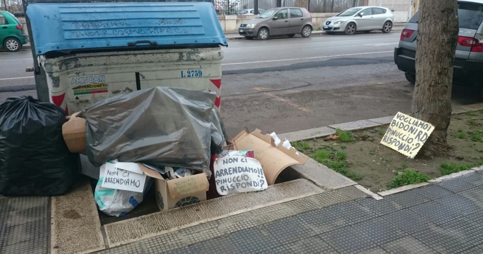 Bari, mancano i bidoni, cittadini esasperati scrivono messaggi sui cartoni