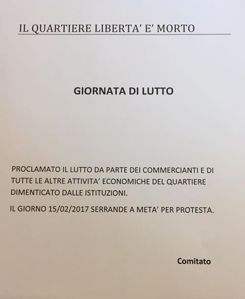 “Il quartiere Libertà è morto”. Comincia così il volantino che è stato distribuito questa mattina a diversi commercianti del rione Libertà. Pronti ad abbassare le saracinesche a metà in segno di protesta nei confronti delle istituzioni. “Proclamiamo – dicono i negozianti – una giornata di lutto da parte di tutte le attività economiche del quartiere dimenticato”. L’appuntamento è per il 15 febbraio.