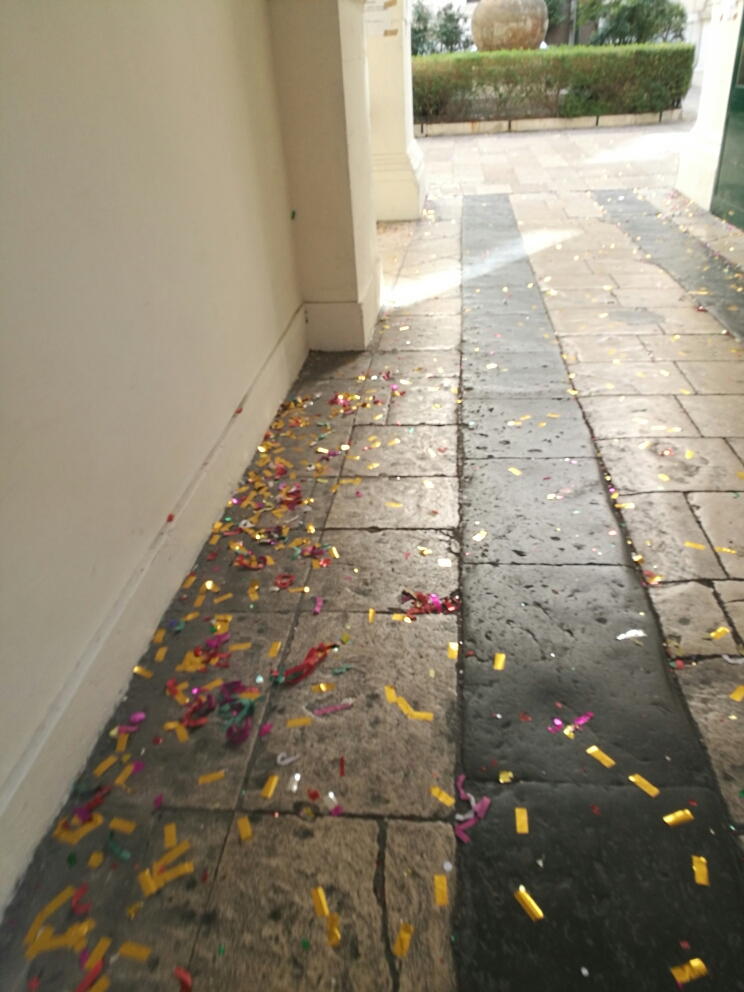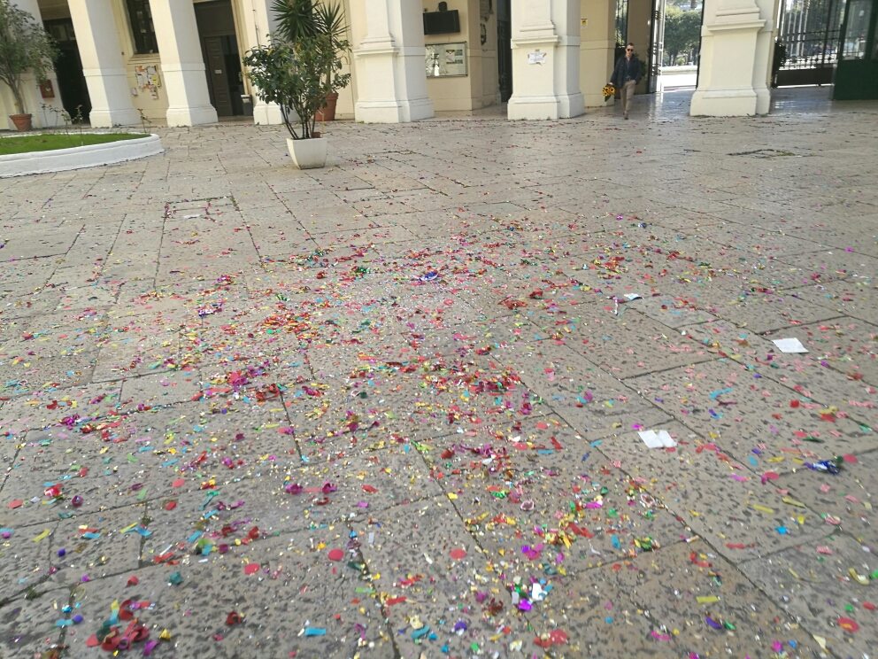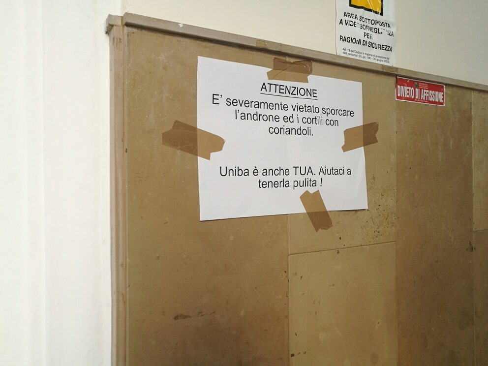 Inutili anche i cartelli affissi nel palazzo dell’Ateneo che invitavano al rispetto dei luoghi: anche all’interno dell’edificio universitario c’era un tappeto di coriandoli. Più volte il rettore Antonio Uricchio ha chiesto agli studenti e ai loro parenti di ripulire le aree, ma non ha mai ricevuto riscontri positivi.
