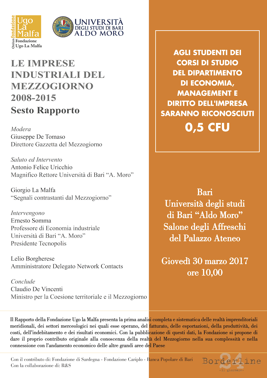Giovedì 30 marzo 2017 alle ore 10.00 alla presenza del Ministro per la Coesione territoriale e il Mezzogiorno Claudio De Vincenti, verrà presentato il Sesto Rapporto sulle Imprese Industriali del Mezzogiorno 2008-2015, realizzato dalla Fondazione Ugo La Malfa Onlus.