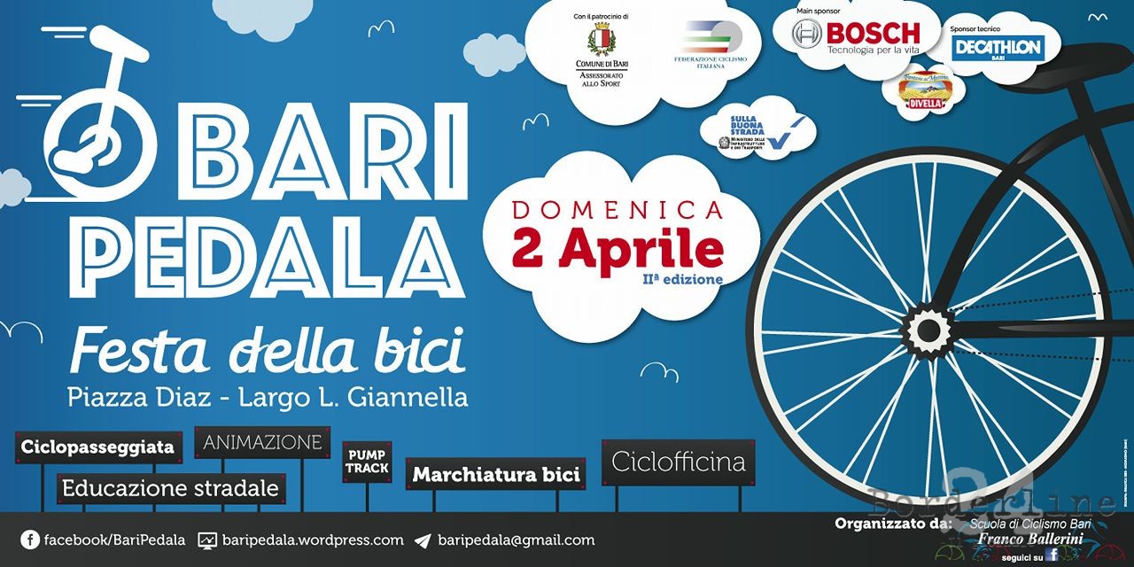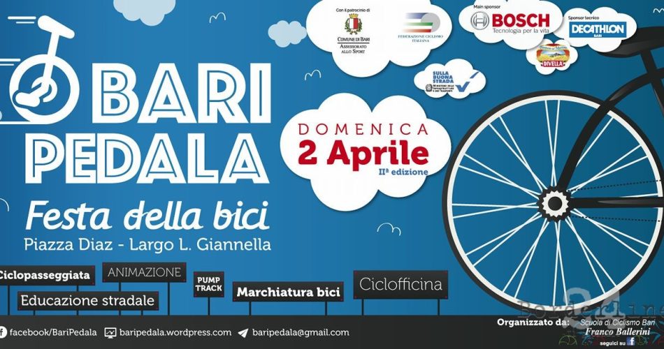 Torna domenica 2 aprile, dalle 8 alle 13, sul lungomare di Bari, la seconda edizione di “Bari Pedala”, la festa delle ruote senza motore organizzata dalla scuola di ciclismo Franco Ballerini di Bari in collaborazione con le associazioni di ciclisti urbani e col patrocinio dell’assessorato allo Sport del Comune di Bari e della Federazione Ciclistica Italiana.