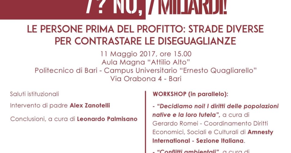 “7? No, 7 miliardi!”. I rappresentanti delle finanze dei sette paesi più ricchi contrapposti ai sette miliardi di uomini e donne, che abitano la terra, assieme ai loro diritti, a cominciare da quelli umani, sociali e ambientali. Nell’aula Magna del Politecnico di Bari, giovedì 11 maggio, giorno dell’inizio dell’appuntamento col G7 delle finanze, a partire dalle 15, le associazioni più importanti, internazionali e italiane, impegnate per la difesa dei diritti, si daranno appuntamento per un incontro che tratterà diversi argomenti riguardanti il futuro della terra.