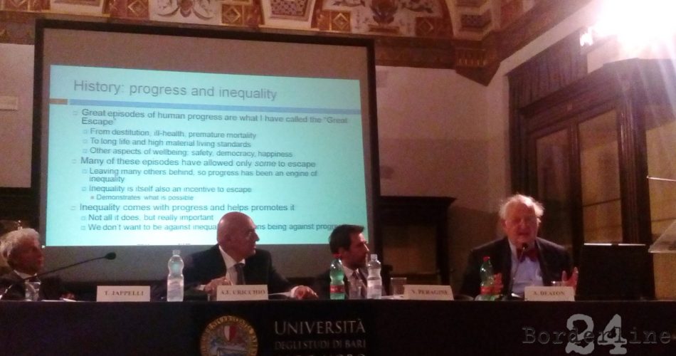 Dopo il benvenuto e l’introduzione del tavolo dei relatori da parte del rettore dell’università di Bari Felice Uricchio, a prendere la parola è il professor Vito Peragine, che ha ripercorso le tappe del percorso di formazione di sir Deaton. Il quale è intervenuto per una lunga digressione che ha ribaltato le concezioni tradizionali di progresso e disuguaglianza.