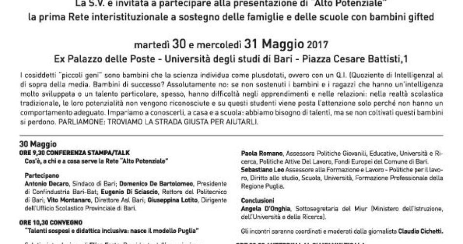 - Il 30 maggio alle 9,30 sarà presentato l’accordo “Alto Potenziale”: una rete amica di scuole e famiglie con bambini gifted.