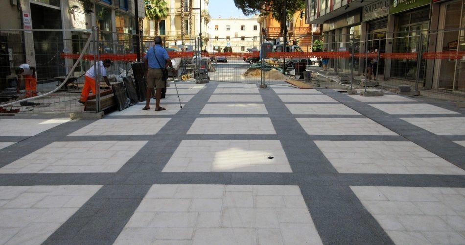 Ecco la nuova pavimentazione del primo isolato di via Sparano, tra corso Vittorio Emanuele e via Piccini. Le mattonelle bianche alternate a strisce grigie hanno un forte impatto visivo, geometrico. Con linee parallele che favoriscono il tanto contestato effetto cannocchiale. I lavori in corso della ditta De Marco rientrano nel progetto di riqualificazione della “shopping street” barese.