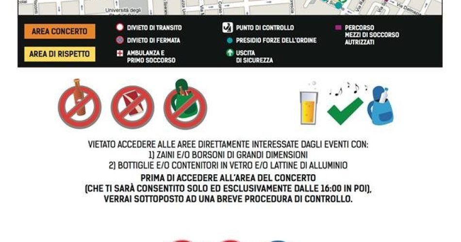 Sette punti di controllo, 23 presidi delle forze dell’ordine, un’area di rispetto (chiusa al traffico) che si estende da Madonnella a corso Vittorio Emanuele. Il Medimex dirama la piantina e le misure di sicurezza previste per il concerto di questa sera di Iggy Pop. L’accesso sarà consentito dalle 16. Tutti saranno sottoposti a controlli con metal detector. Vietate bottiglie di vetro e lattine. Si potrà accedere solo con bottigliette d’acqua o bicchieri di plastica. Vietati anche agli zaini di grandi dimensioni.