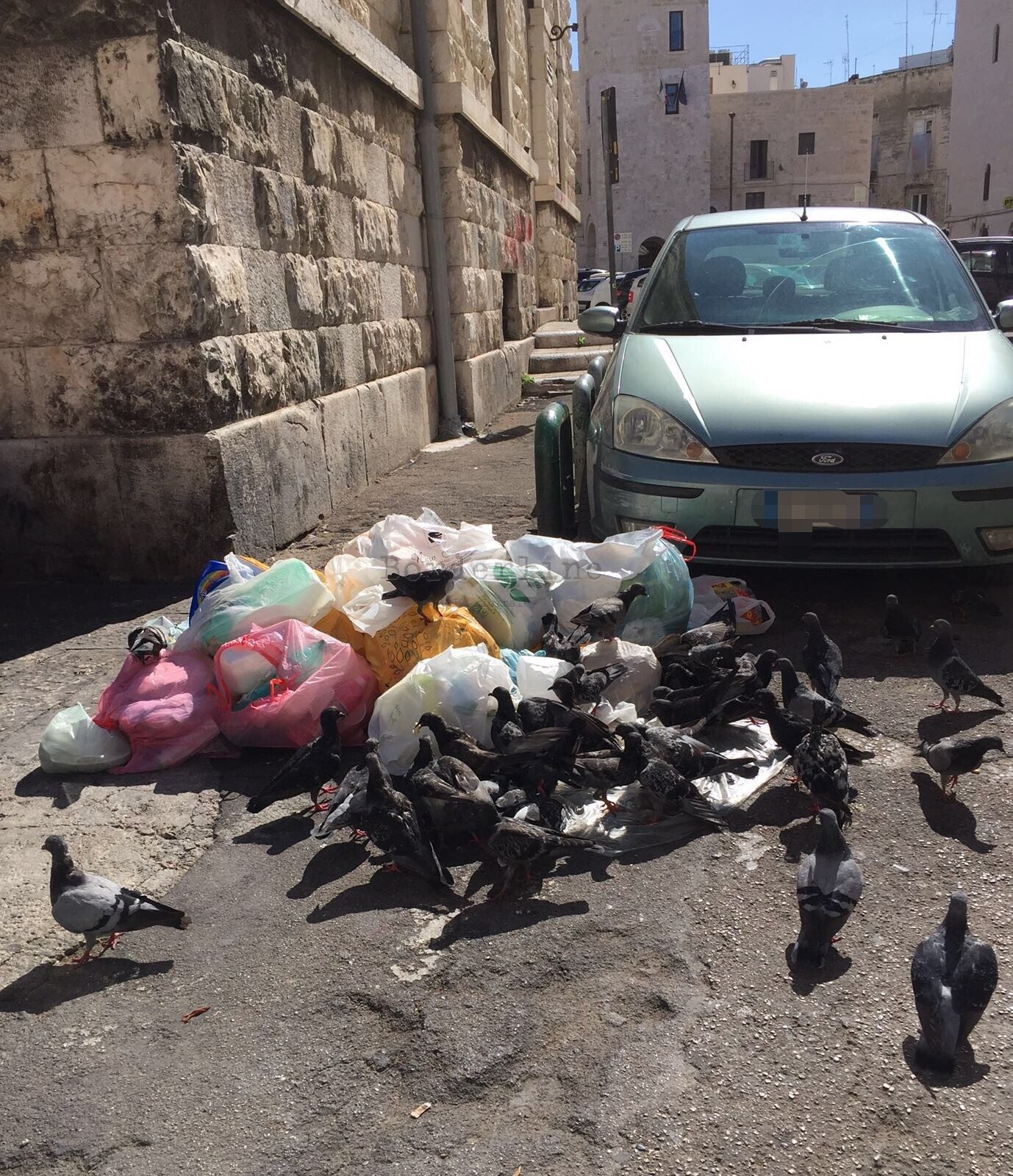 Bari vecchia, ancora immondizia per strada: colombi “pranzano” alle spalle della Cattedrale