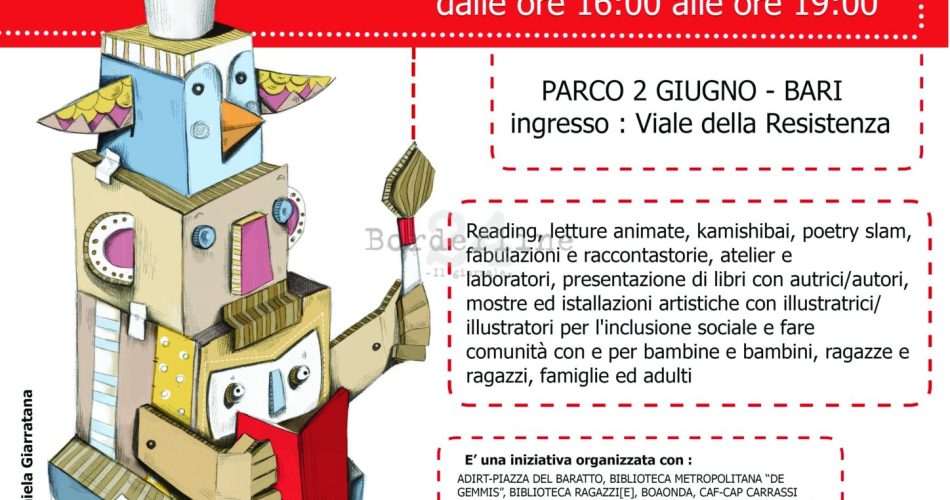 Il festival, che rientra tra le 100 attività gratuite organizzate nell’ambito del cartellone “Bari social Summer”, intende promuovere la lettura come strumento di inclusione, di crescita individuale e collettiva e di coesione sociale, in uno spazio pubblico molto frequentato, in particolare nel periodo estivo. Il programma prevede 32 incontri tra eventi e attività, realizzati da 27 diversi enti e organismi: l’appuntamento è dalle ore 16 alle 19, all’interno di parco 2 Giugno (con ingresso da viale della Resistenza).
