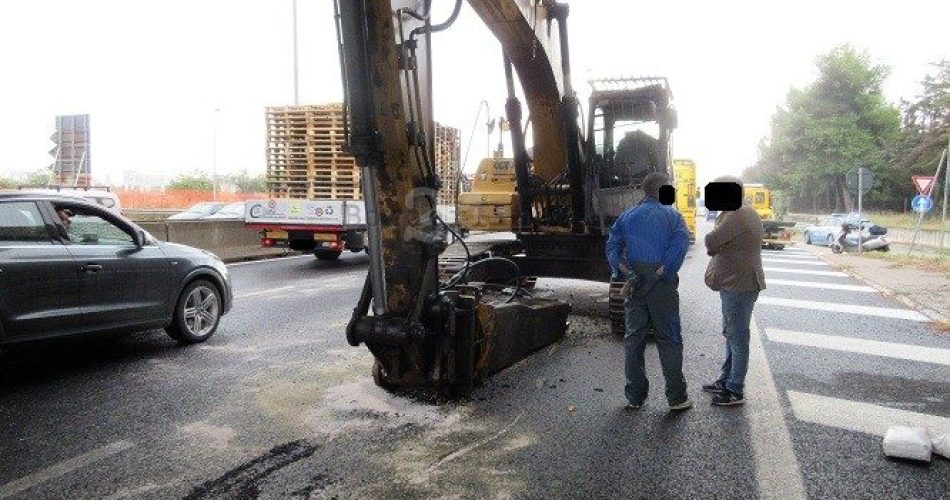 Cavalcavia sventrato nell’impatto e traffico bloccato con code fino a 10 km in direzione sud. Sono le conseguenze di un furto fallito intorno alle 5 di questa mattina da parte di un commando che ha prima rubato un caterpillar da una ditta di smaltimento vagoni del San Paolo e poi lo ha abbandonato a bordo strada all’uscita di Santa Caterina.