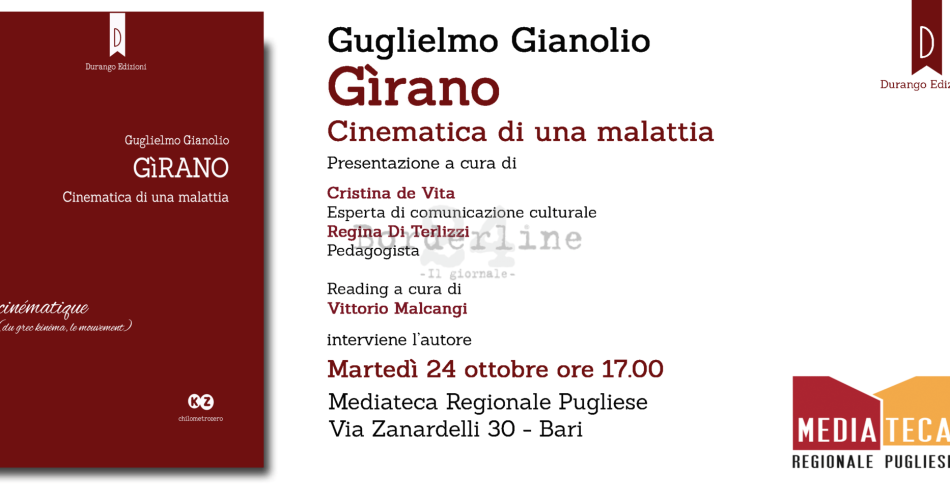 Martedì 24 ottobre alle ore 17 nella Mediateca regionale pugliese a Bari (via Zanardelli, 30), si terrà la presentazione di “Gìrano – Cinematica di una malattia” di Guglielmo Gianolio, edito da Durango Edizioni, primo titolo della nuova collana “Chilometro Zero”. La presentazione sarà a cura di Cristina de Vita, esperta di comunicazione culturale, e Regina Di Terlizzi, pedagogista. Reading a cura di Vittorio Malcangi.