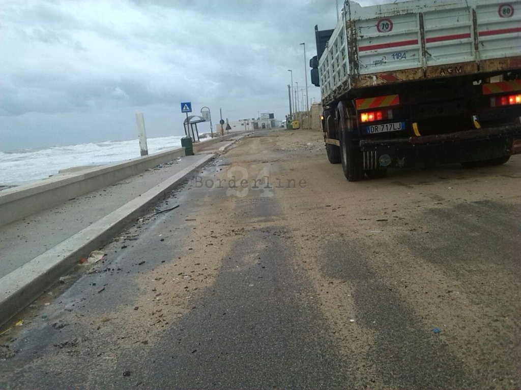 Sulla spiaggia di Pane e Pomodoro il mare agitato sta lasciando sulla sabbia rifiuti in plastica di ogni tipo, poco distante sul lungomare Nazario Sauro le onde superano i frangiflutti e invadono la carreggiata (come mostra il video).
