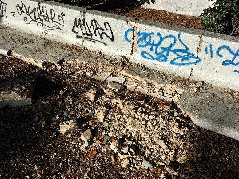 Nelle ultime ore – come mostra la foto – si registrano ulteriori raid vandalici: pezzi di cemento armato lasciati tra i cespugli vengono usati per colpire altre lastre ancora intatte e imbrattate con le bombolette spray. Nessun intervento di manutenzione o ripristino è stato finora effettuato. Nemmeno la messa in sicurezza dei cumuli di cemento e dei ferri arrugginiti.