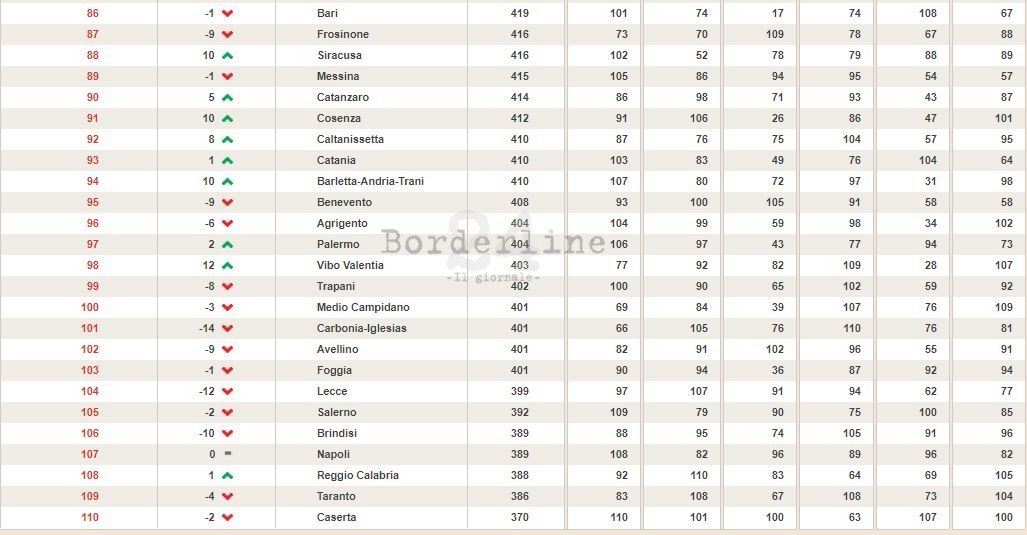 Le province di Bari e della Bat sono le più alte nella classifica, anche se non superano l’86esimo posto. Prima in Puglia è Bari, che perde una posizione e che registra risultati scadenti per i parametri di Giustizia e sicurezza (scendendo addirittura al 108esimo posto) e Ricchezza e consumi (101)