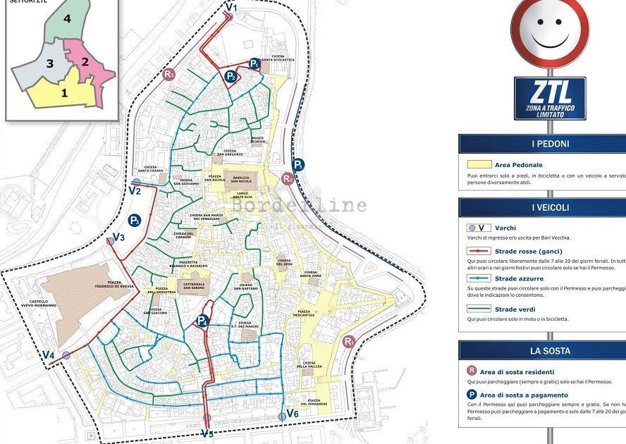 Nelle strade “rosse” la circolazione è libera esclusivamente nei giorni feriali (dalle ore 7 alle 20) mentre in tutti gli altri periodi è consentita ai soli muniti di permesso. Invece uno dei monumenti simbolo della città è perimetrato da decine di auto che passando dall’arco antistante al lungomare vi accedono indisturbati.