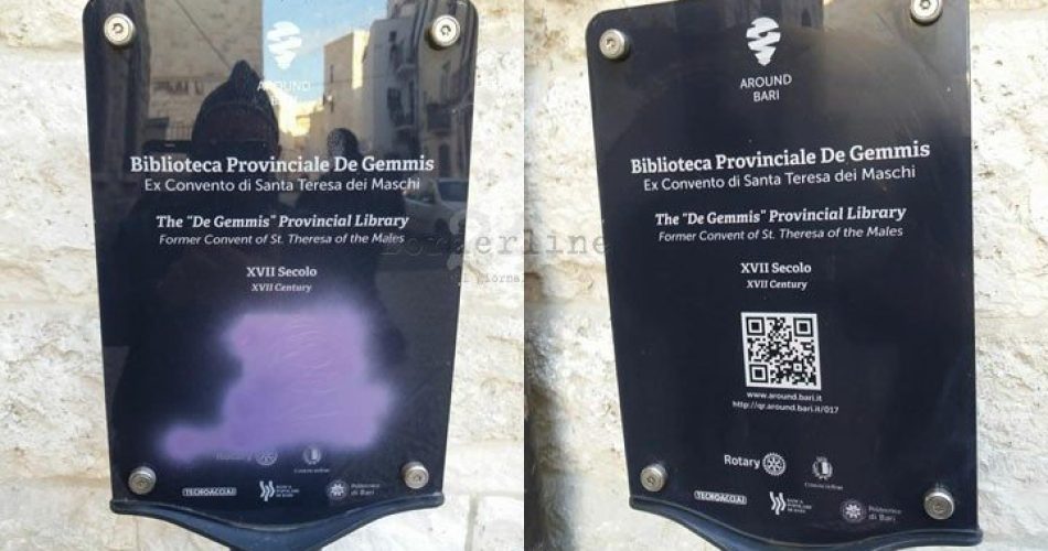 Vandali in azione a Bari vecchia, dove il codice QR della palina della Biblioteca De Gemmis, ex convento di Santa Teresa dei Maschi, è stato reso inutilizzabile da una copiosa passata di spray. A denunciare l’ennesima calata degli unni è stato l’assessore comunale Silvio Maselli, con due foto che mostrano la palina imbrattata e quella nuova e perfettamente utilizzabile: “Voi rompete? Noi aggiustiamo. Voi sporcate? Noi ripuliamo. C’è una Bari migliore. E vincerà. Alla fine, vincerà” il messaggio di Maselli, con il tag di Amiu Puglia e del presidente dell’azienda, Sabino Persichella.