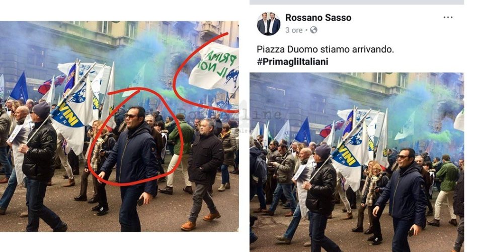 Un candidato della Lega coordinatore del partito in Puglia, Rossano Sasso, che cancella da una foto del corteo di sabato scorso a Milano una bandiera con la scritta “Prima il Nord” ha fatto inalberare il governatore della Lombardia Roberto Maroni.