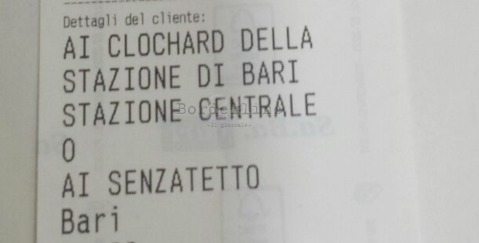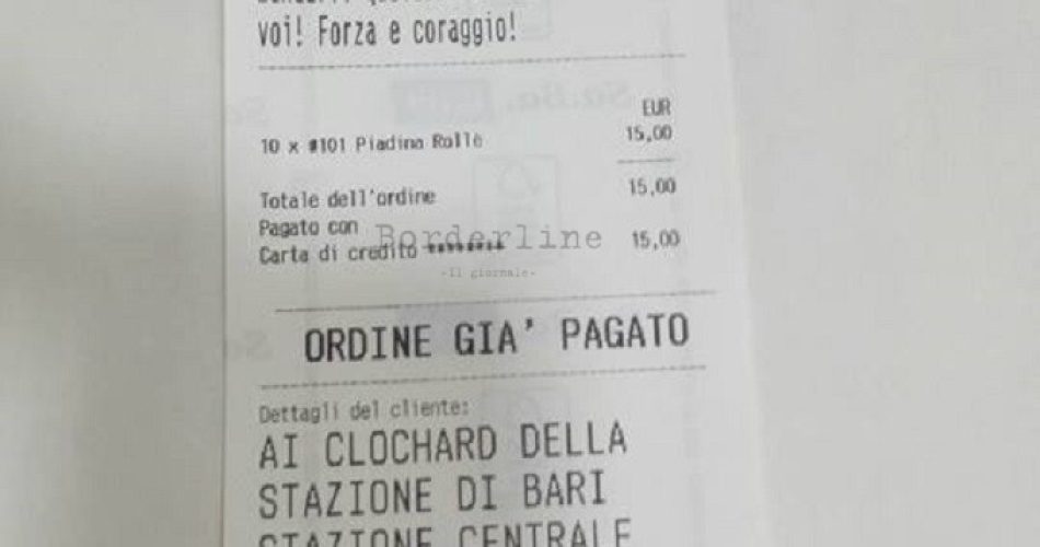 Acquista attraverso l’App 10 piadine e le fa portare ai senzatetto che, ogni notte, cercano riparo tra le mura della stazione centrale di Bari. Autore del gesto un ragazzo di 25 anni, l’ordine e lo scontrino sono stati pubblicati sulla propria pagina facebook dalla pizzeria Break 184 di Bari.