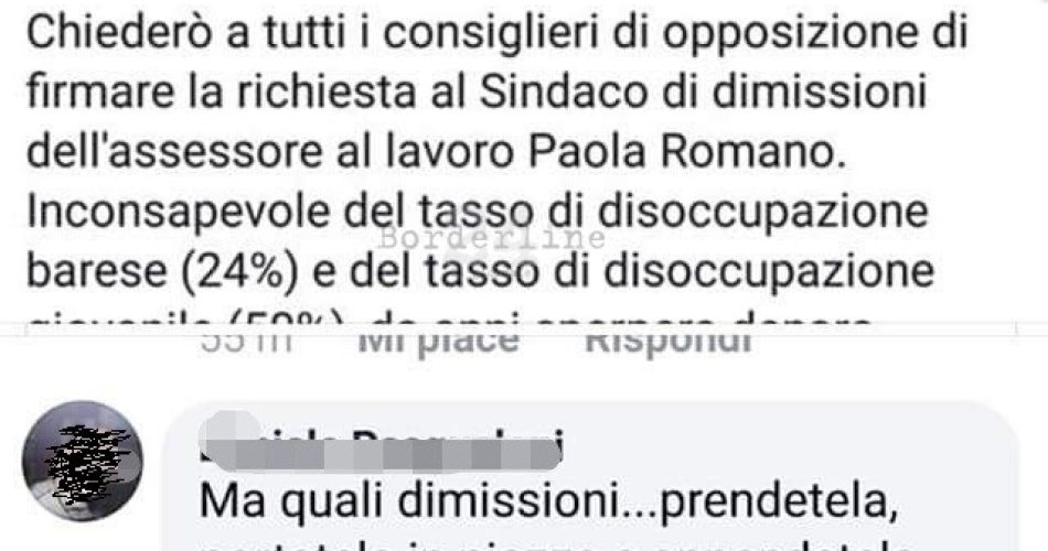 “Prendetela, portatela in piazza e appendentela per il collo”. Cosi un barese, commentando un post su facebook con il quale il consigliere Giuseppe Carrieri criticava un bando comunale, ha preso di mira e ha aggredito verbalmente l’assessore Paola Romano, arrivando praticamente a minacciarla. Carrieri ha preso le distanze dal commento, la diretta interessata invece ha replicato così: “Non sono solita fare la vittima – scrive – credo fortemente in quello che faccio e rispetto il ruolo delle istituzioni, della giunta e dei consiglieri. Quella che non posso rispettare è la violenza, verbale o fisica ad ogni livello. Nessuno è legittimato a chiedere la mia impiccagione in pubblica pizza come quella di nessun altro”. E poi chiosa: “Denuncerò alla polizia postale l’accaduto”.