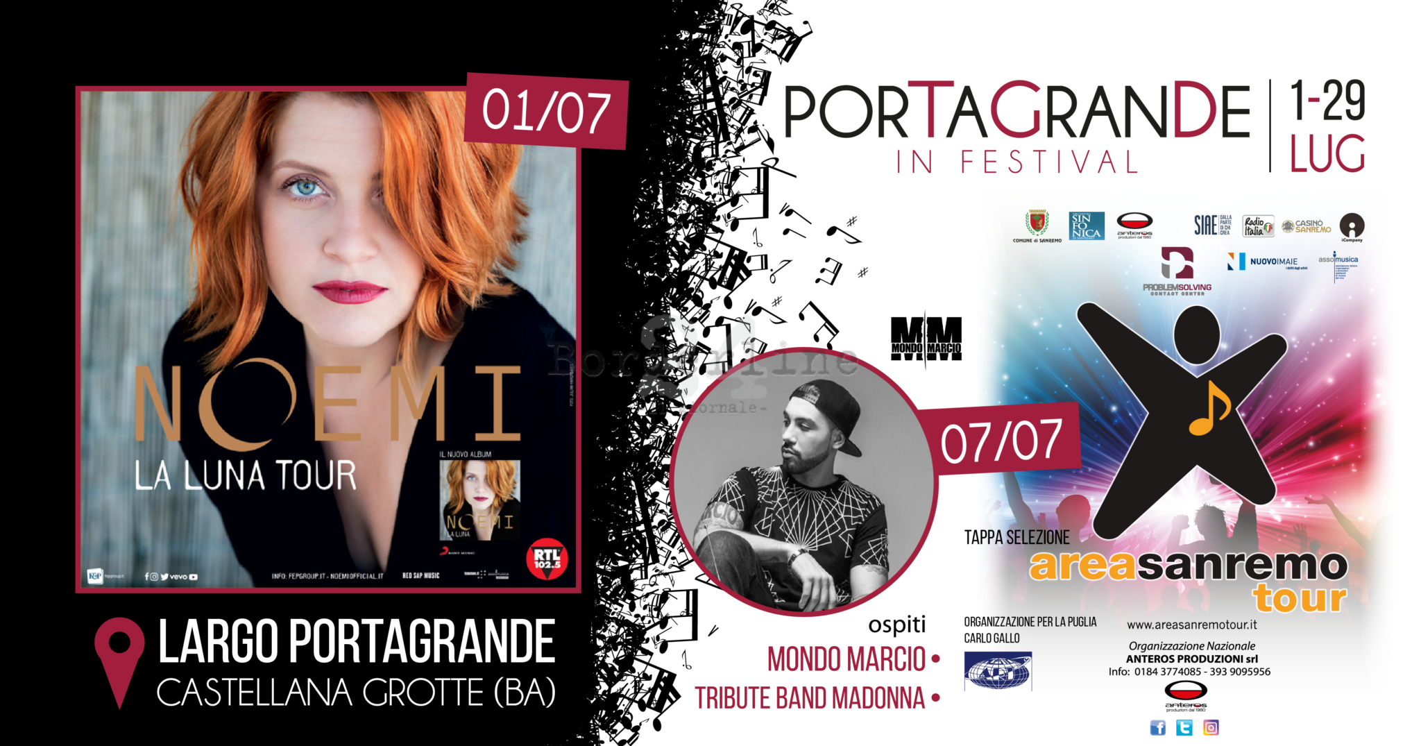 Il tutto prenderà il via domenica 1° luglio, infatti, con l’attesissimo live di Noemi, che farà tappa a Castellana Grotte per la sua unica data nella provincia di Bari con “La luna tour”. Dopo questo primo appuntamento, largo Porta Grande si trasformerà in un vero e proprio villaggio del divertimento, fra spettacoli di varia natura e giochi e intrattenimento per bambini, e del gusto grazie alle tante iniziative in programma e alla gustosa proposta gastronomica di cibi tipici e golosità.